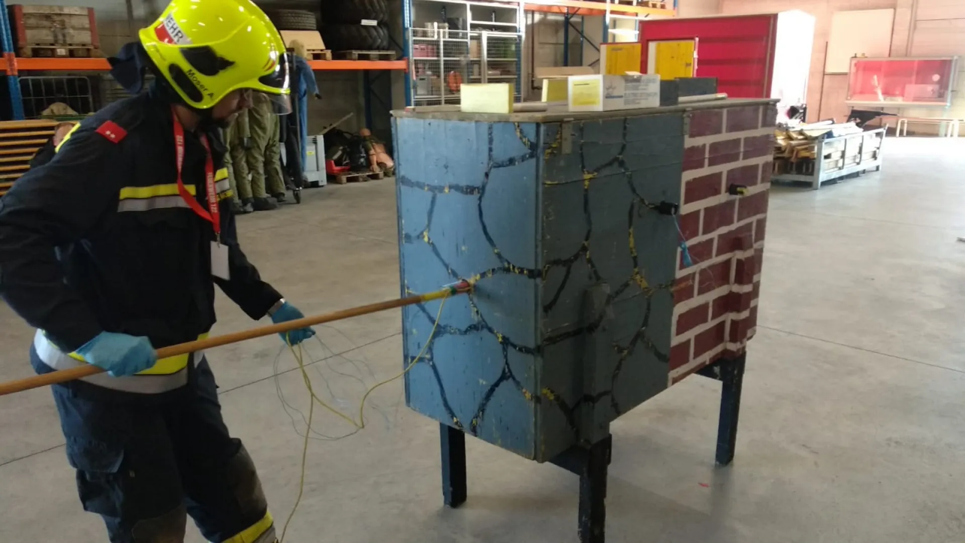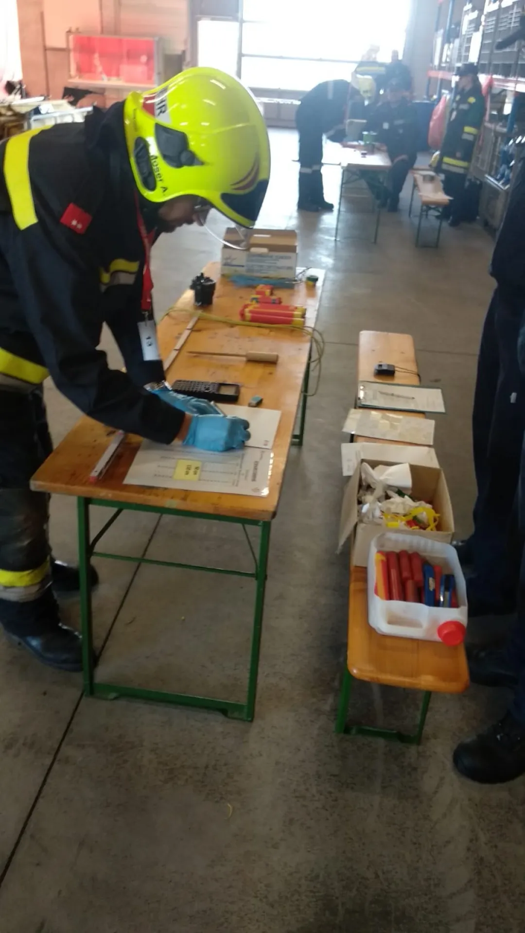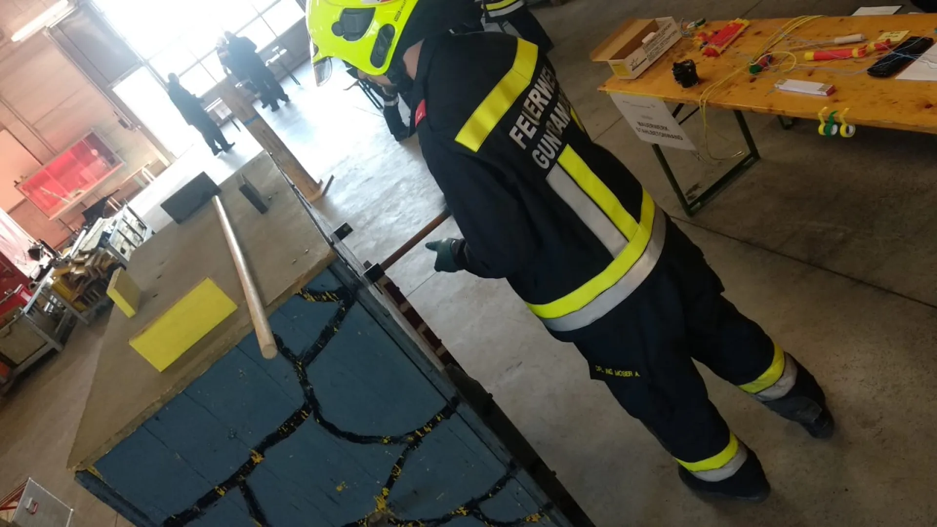 Die Erste Station fand im Lehrsaal statt. Bei einer Klausurarbeit mussten innerhalb von zwei Stunden diverse Parameter für die Sprengung einer Stahlbetonwand, Betonfahrbahnplatte, Gestein, Piloten, Ziegelschornstein sowie Eis berechnet werden.
