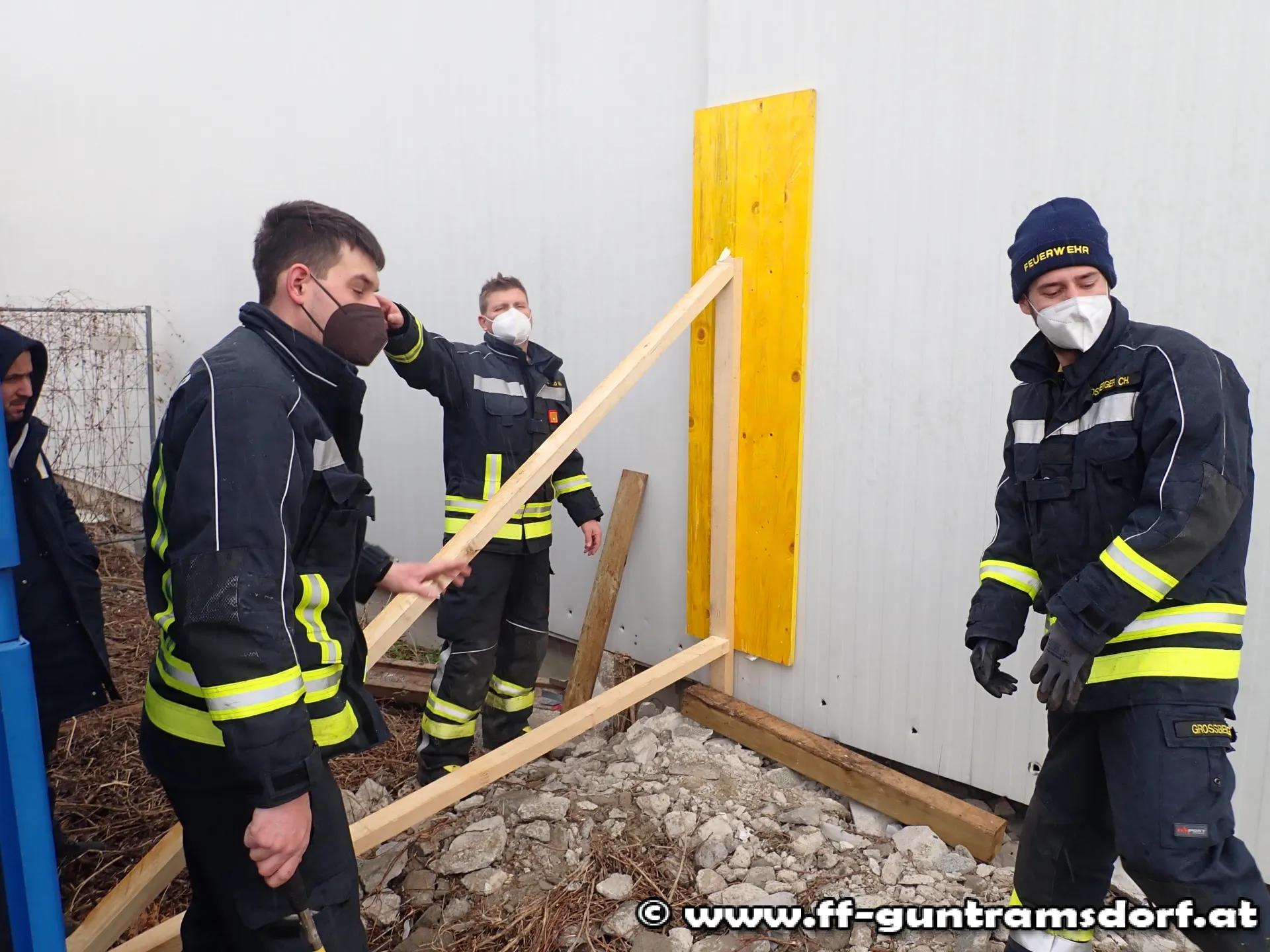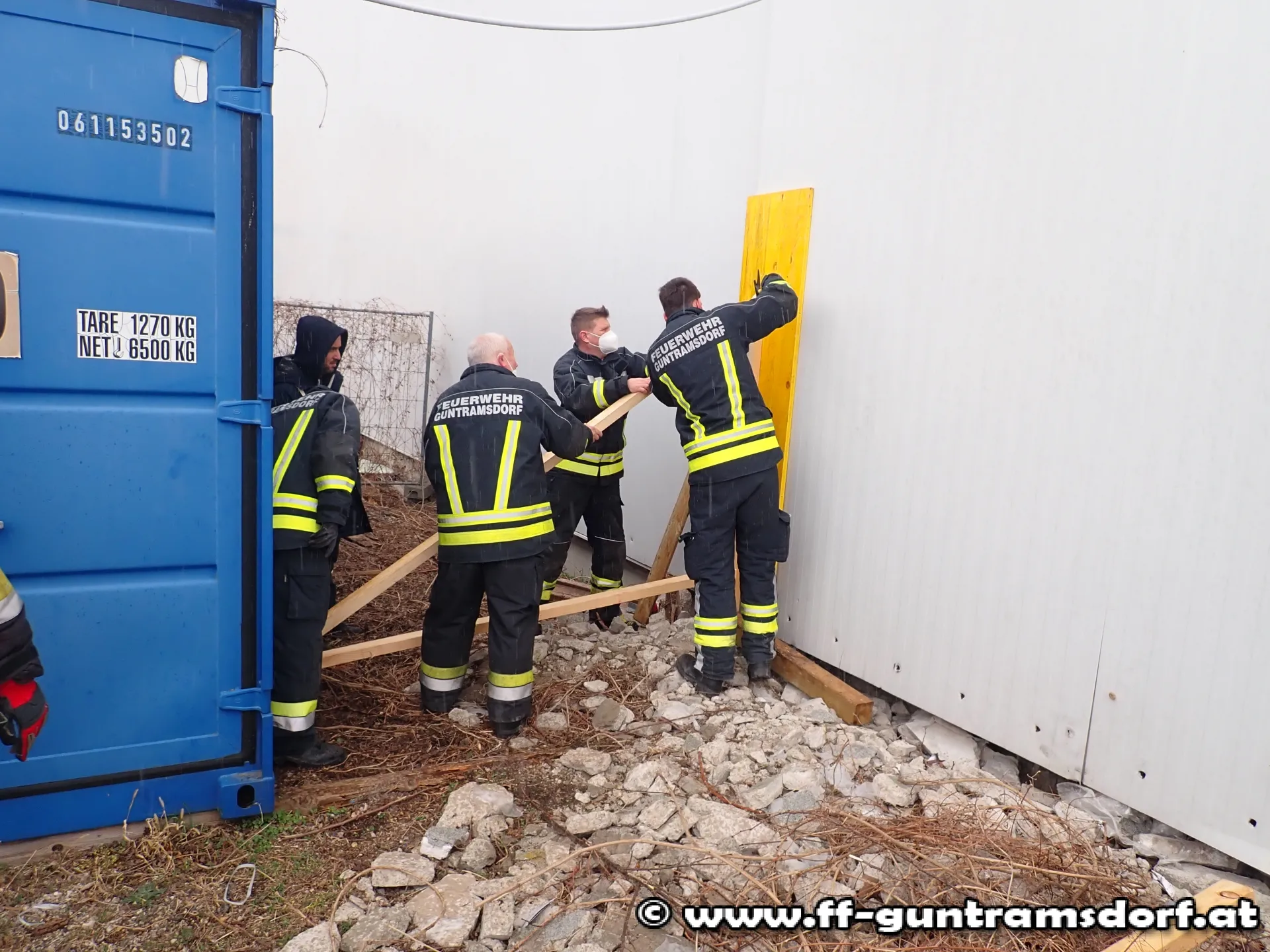 Auf dem Gelände der Druckfabrik hatte ein Stapler die Dämmpaneelwand einer Halle so weit nach außen gedrückt, dass nicht auszuschließen war, dass diese durch den starken Wind zur Gänze herausgerissen werden könnte. Mit Hilfe einiger Staffelhölzer und einer Schalungsplatte wurde die Wand von außen gesichert.