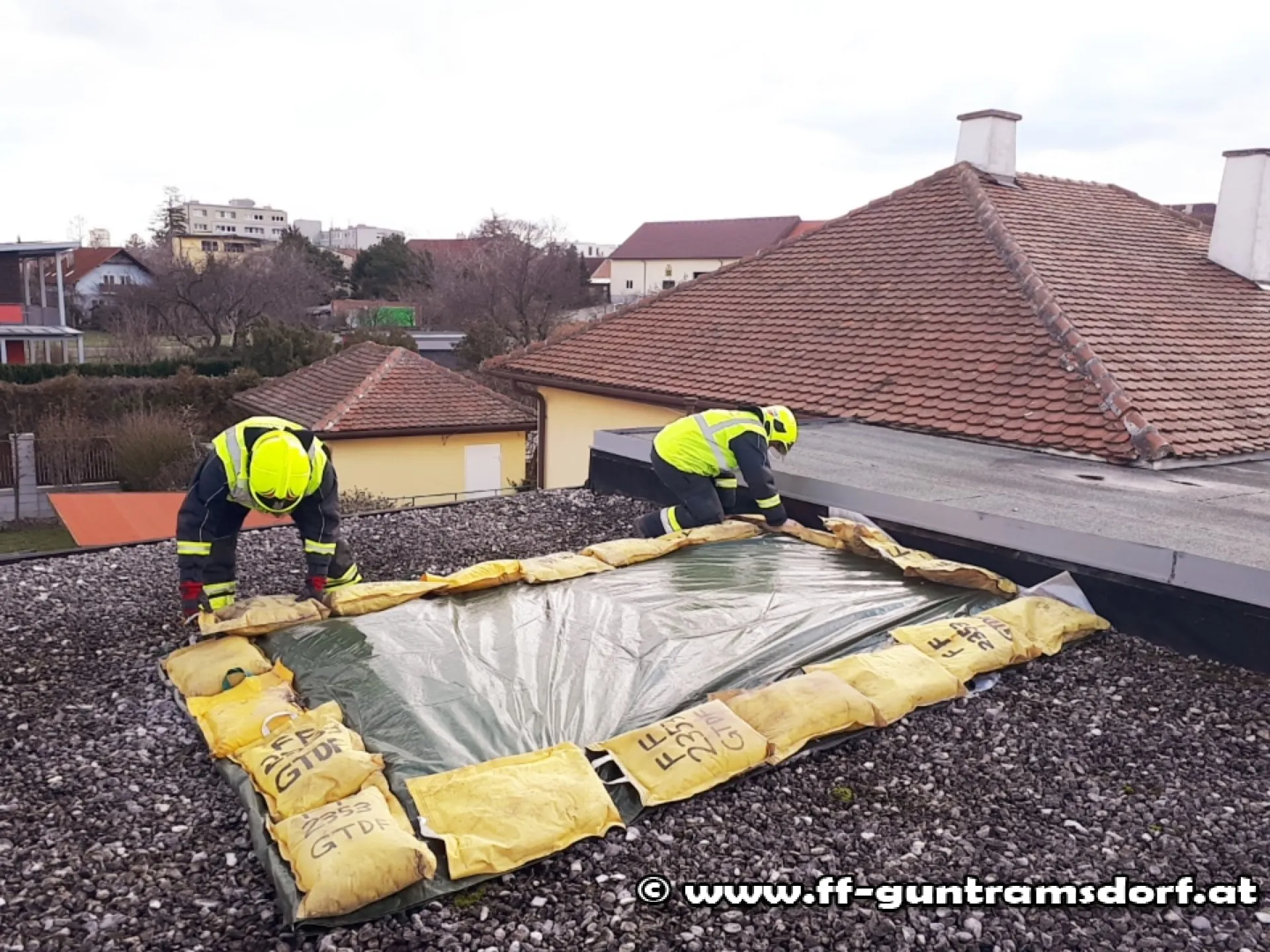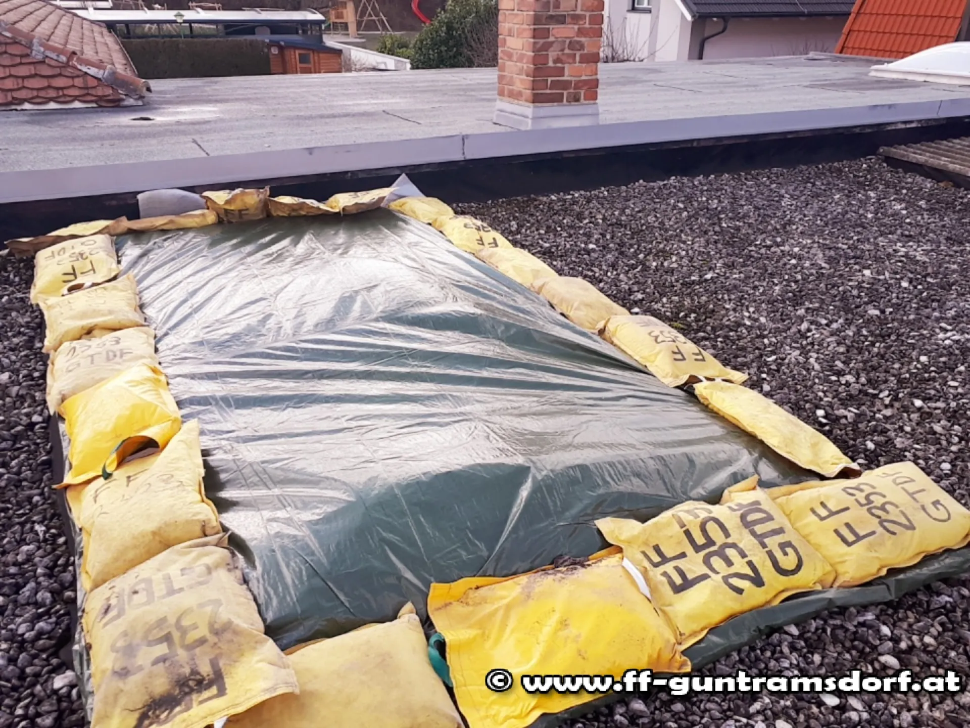 Mittels Plane und Sandsäcken wurde der teilweise abgedeckte Dachbereich provisorisch verschlossen.//aho