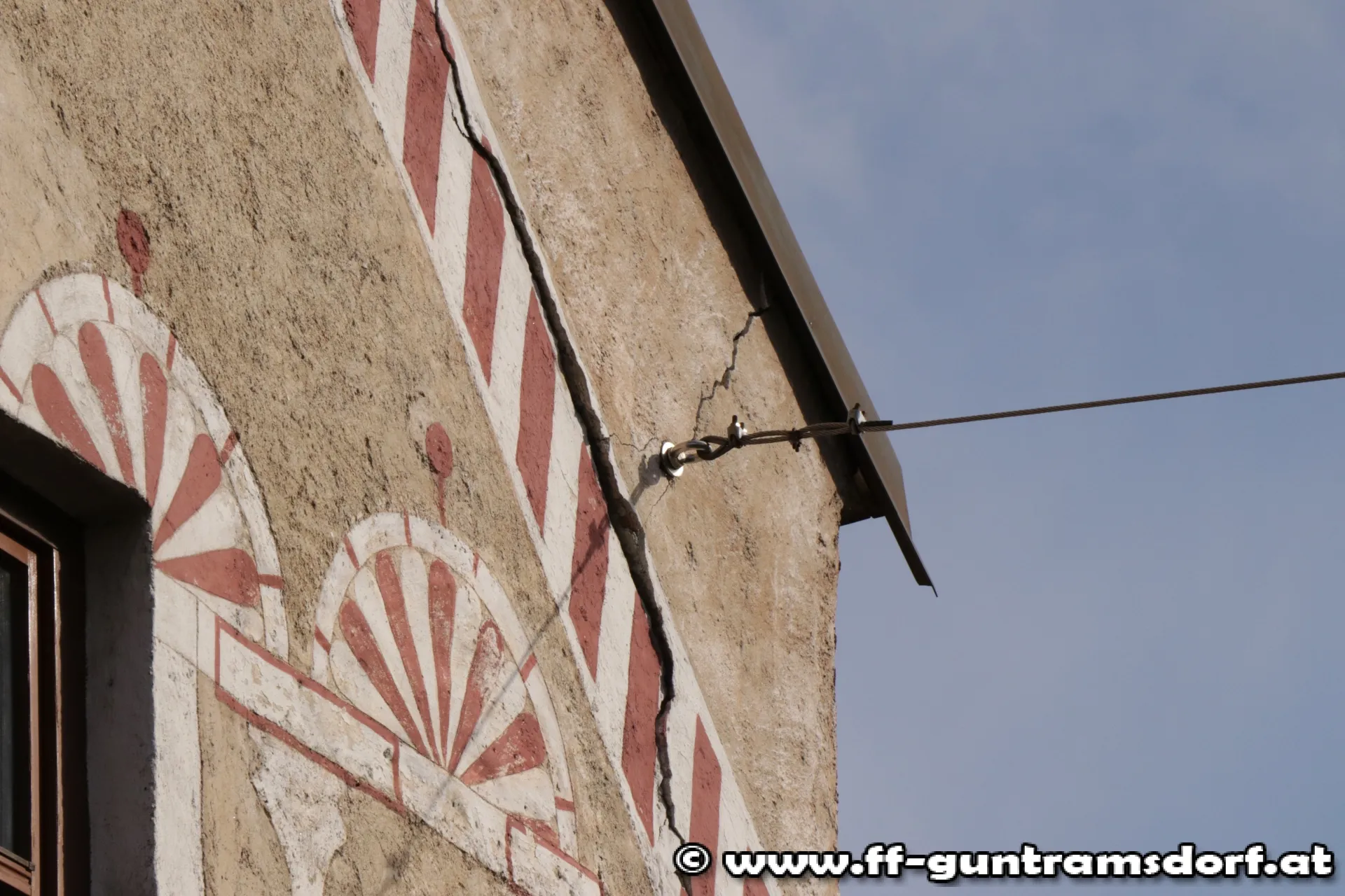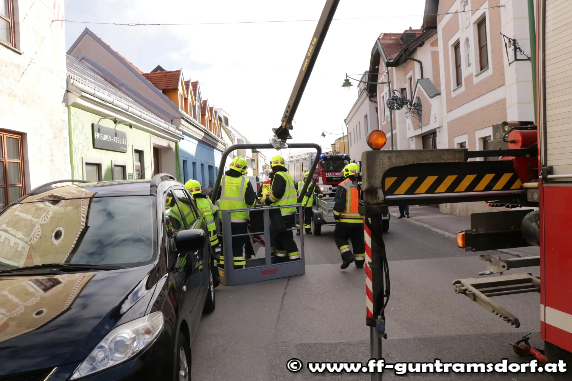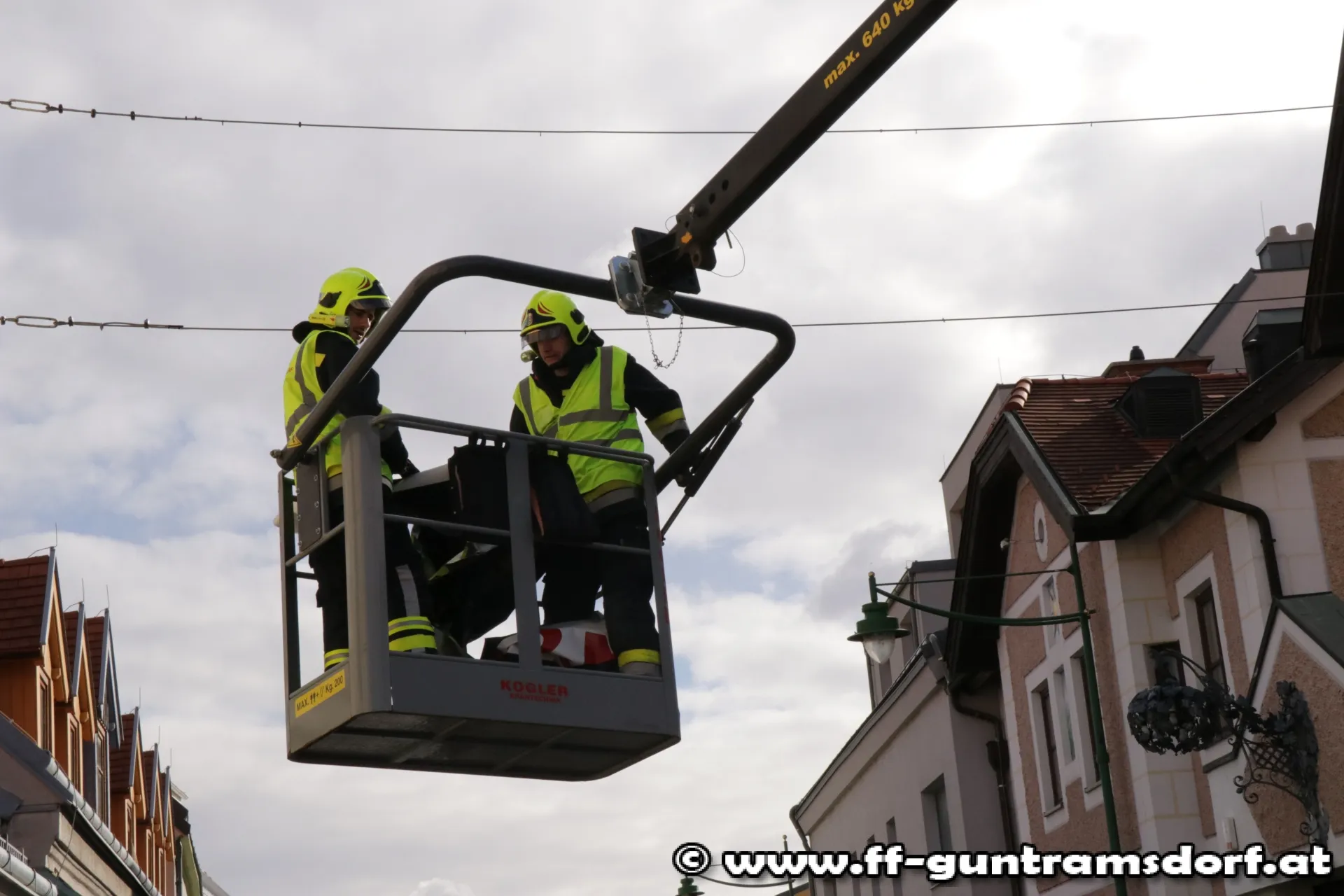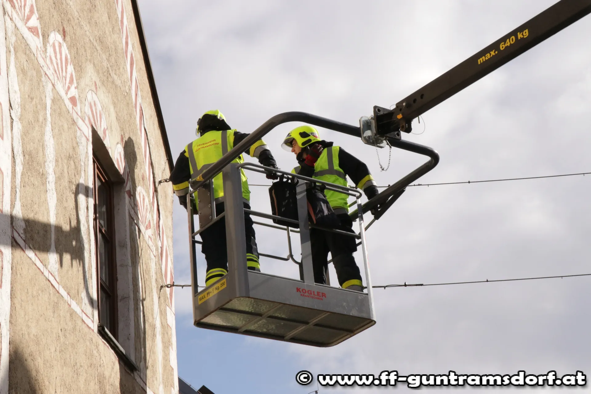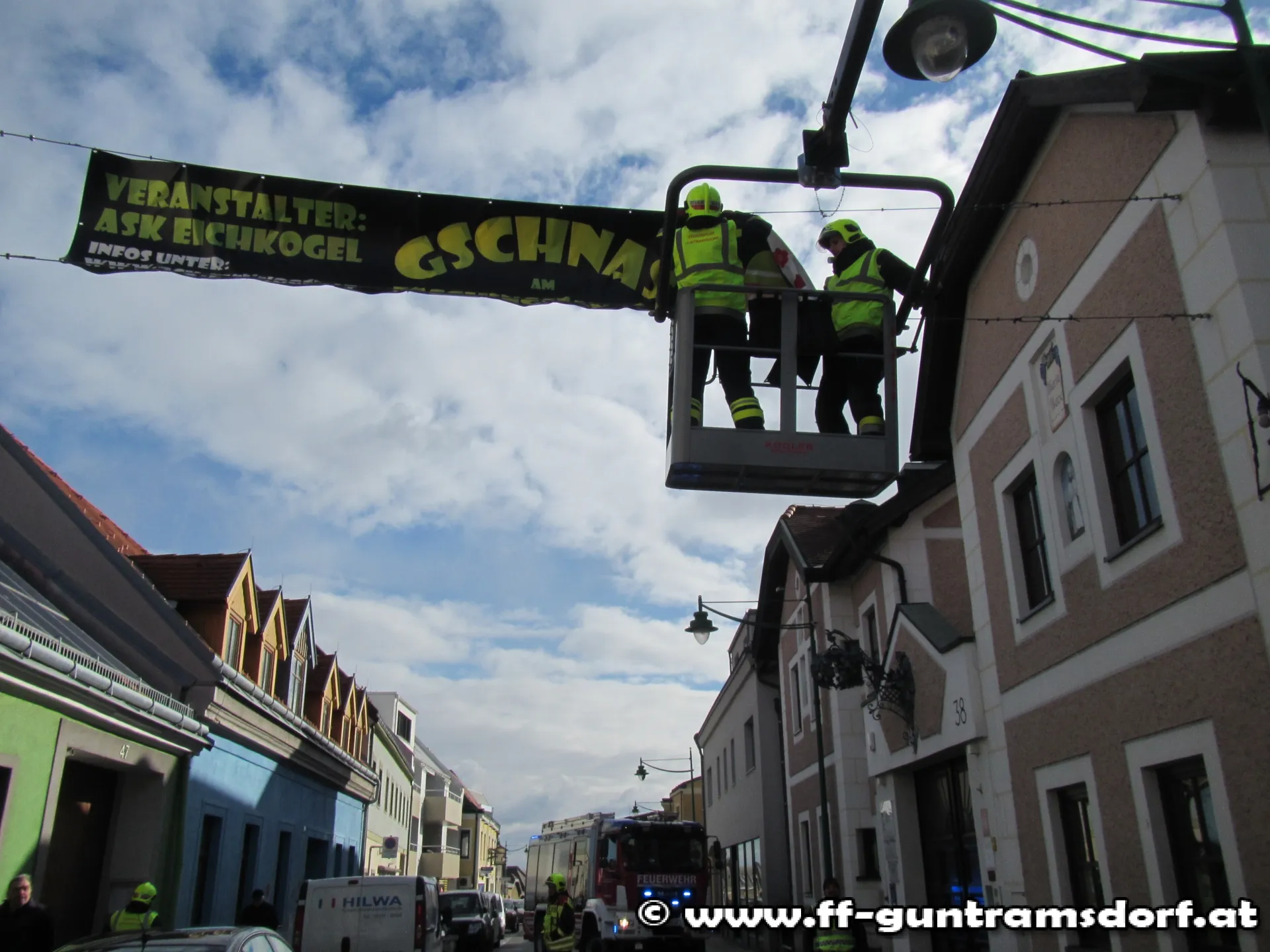 Am vormittag wurde der Feuerwehr gemeldet, dass der starke Wind die Verankerung eines über die Hauptstraße gespannten Transparentes gelockert hatte. Da die Gefahr bestand, dass die Verankerung aus der bereits beschädigten Mauer gerissen werden könnte, wurde das Transparent abmontiert.