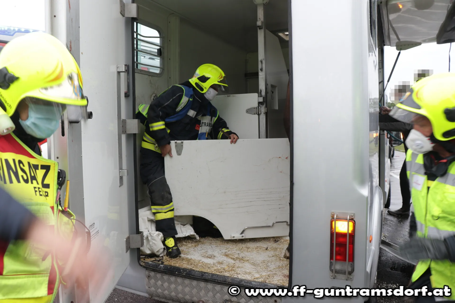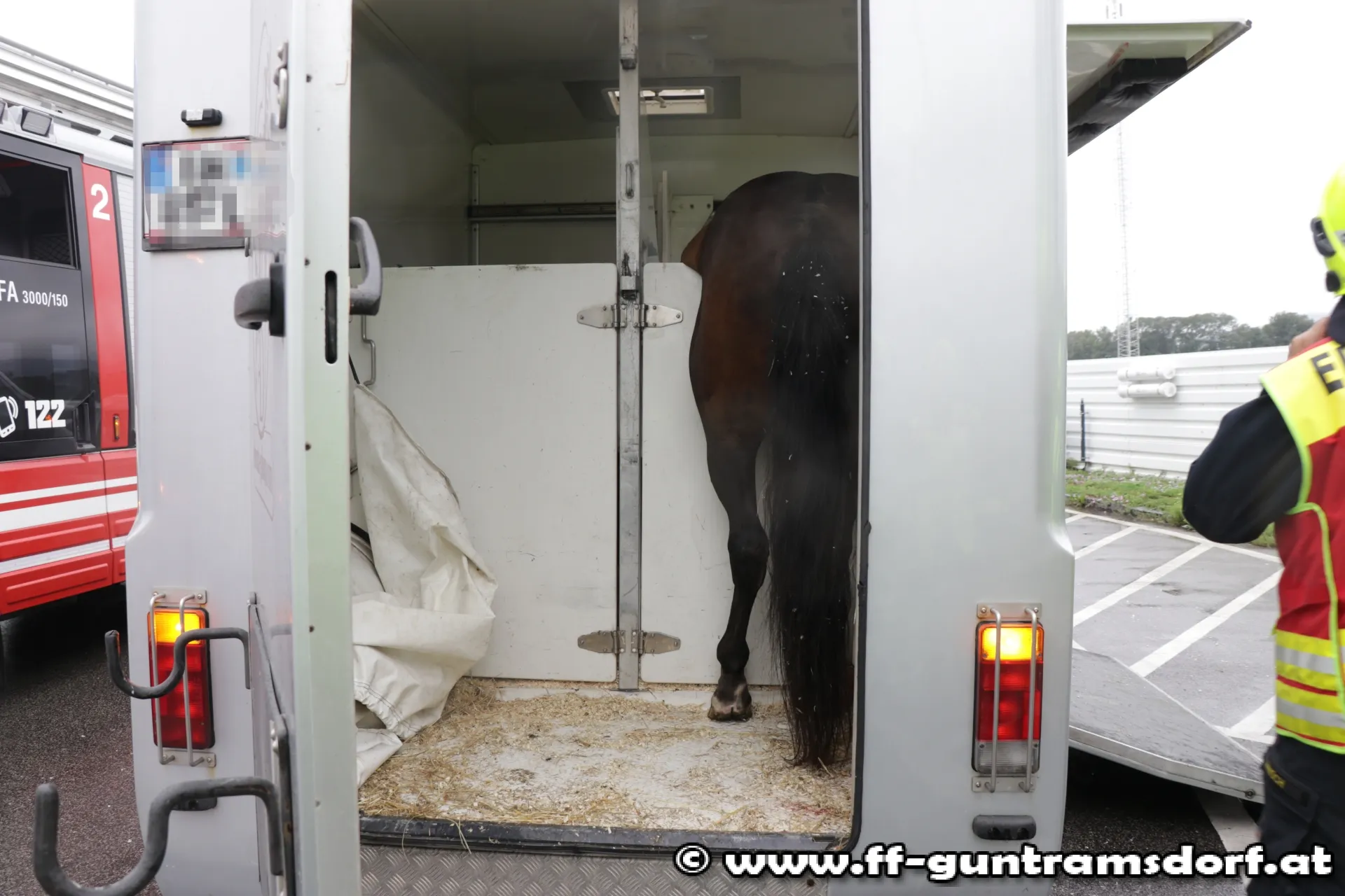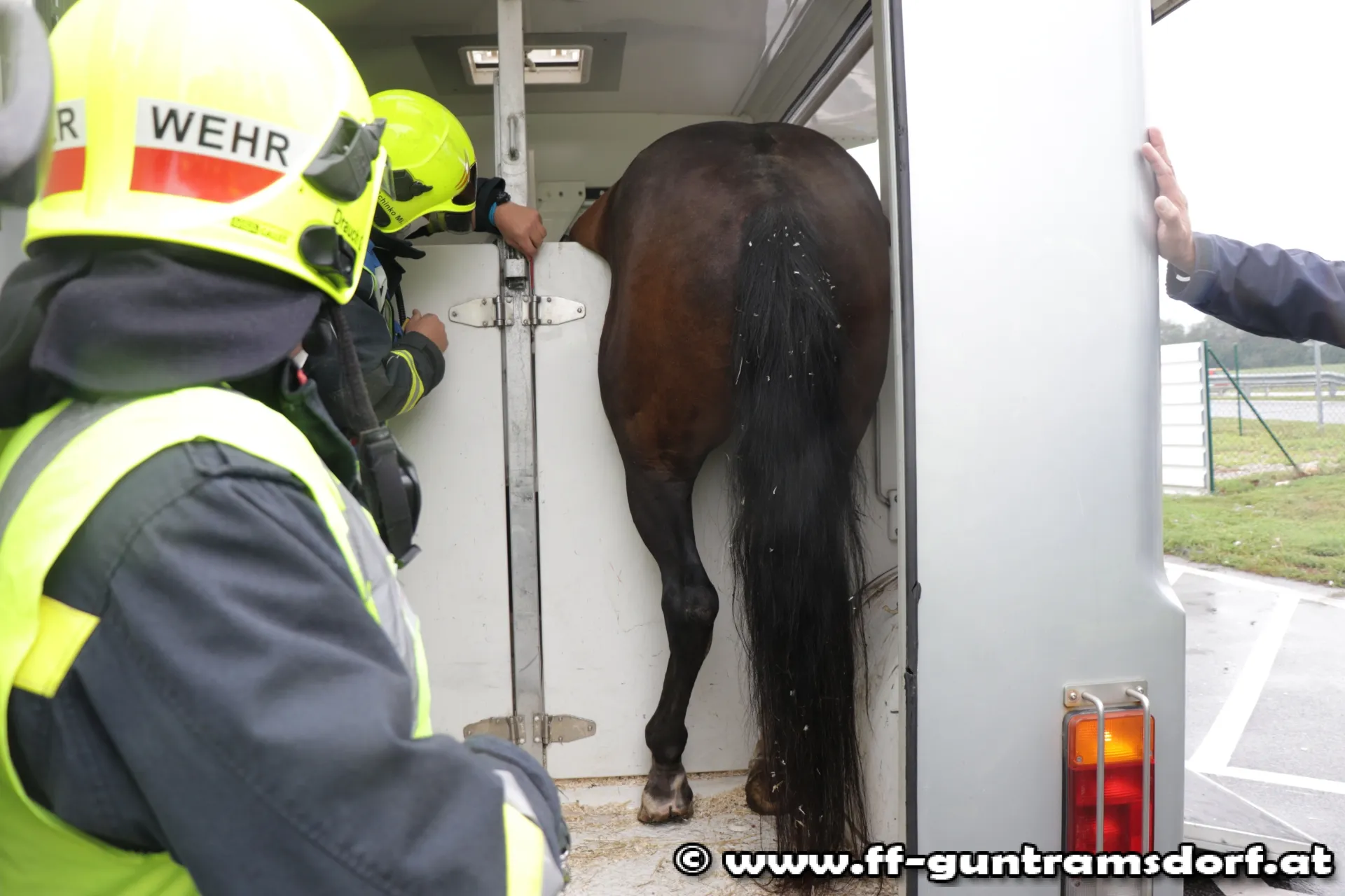 Das Pferd „Laurus-C“ hatte sich in einem Pferdetransportanhänger mit den hinteren Beinen so unglücklich bei einer Trenntüre eingeklemmt, sodass es dem Pferd nicht möglich war sich mit eigenen Kräften aus der misslichen Lage zu befreien. Versuche des Besitzers das Pferd zu befreien blieben leider auch erfolglos.