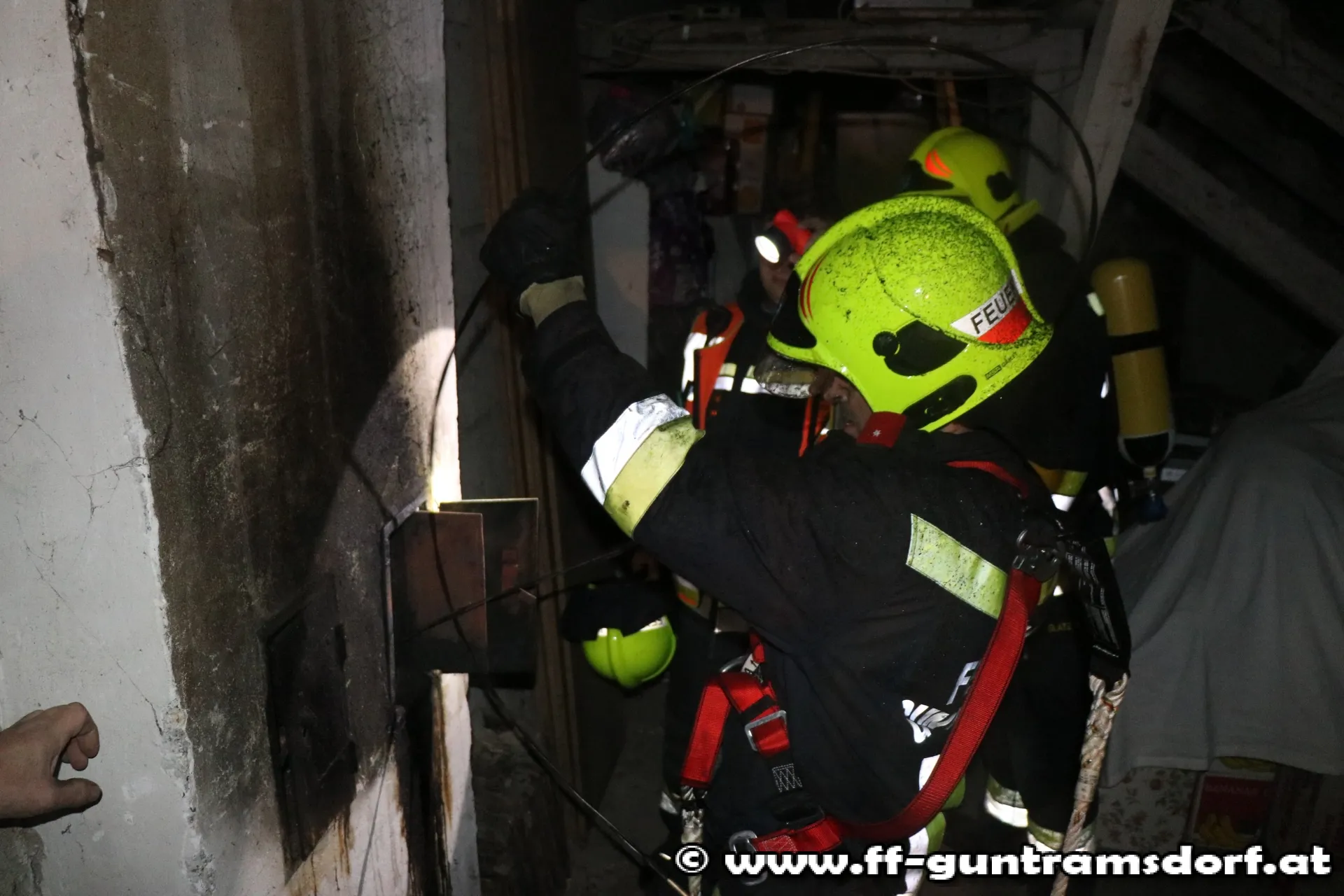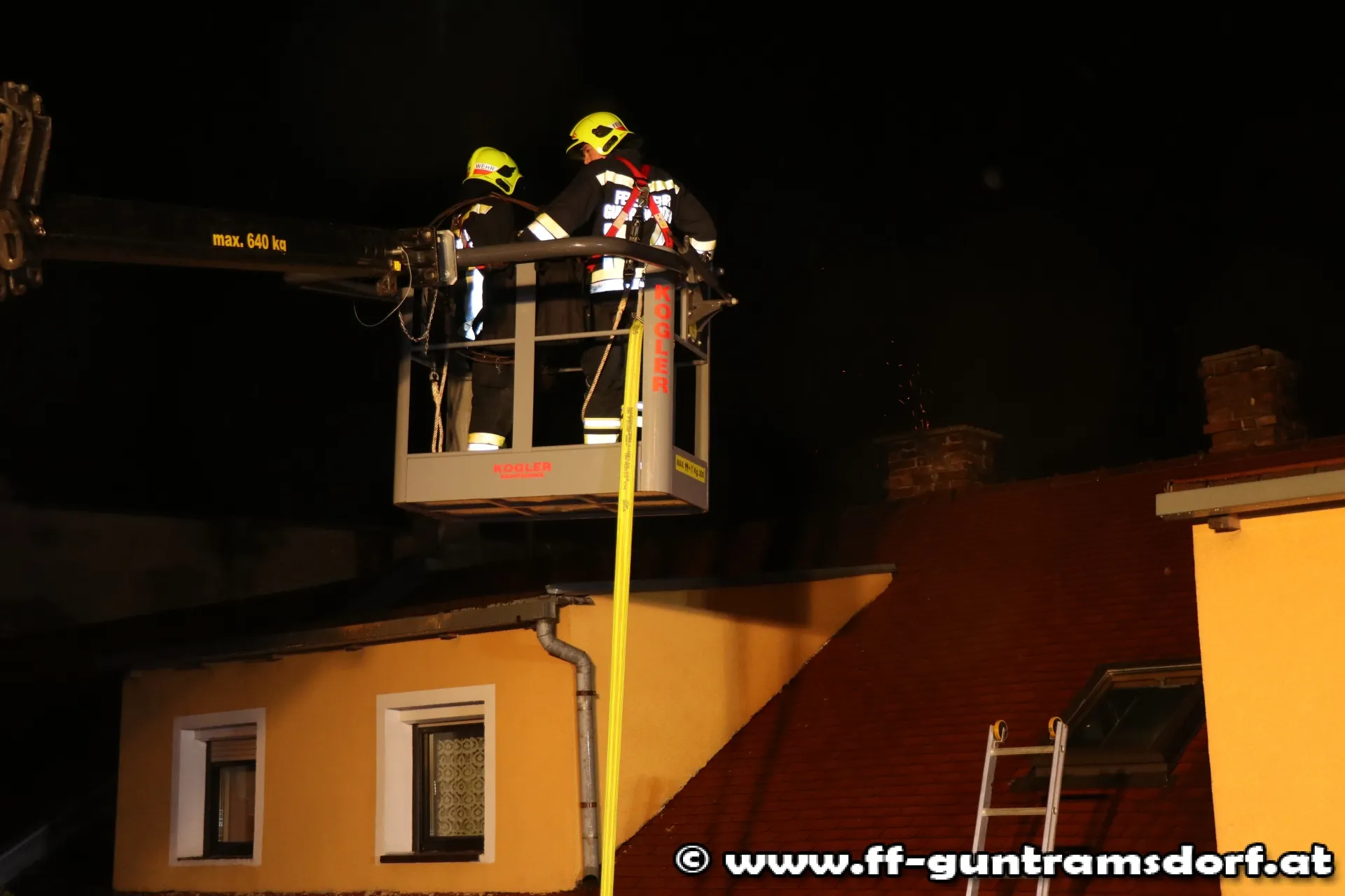 Am Einsatzort angekommen, konnte zum Glück „nur“ ein Kaminbrand und eine starke Verrauchung des Dachboden festgestellt werden. Der Atemschutztrupp „HLF“ kontrollierte mit einer Wärmebildkamera das Dachgeschoss und der Atemschutztrupp „TANK 3“ begab sich in den Keller. Beide Kontrollen verliefen negativ. Die Feuerwehr Guntramsdorf hat das Glück, mehrere Rauchfangkehrer in ihren Reihen zu haben, sodass diese gleich mit der Kehrung des Kamins begannen.