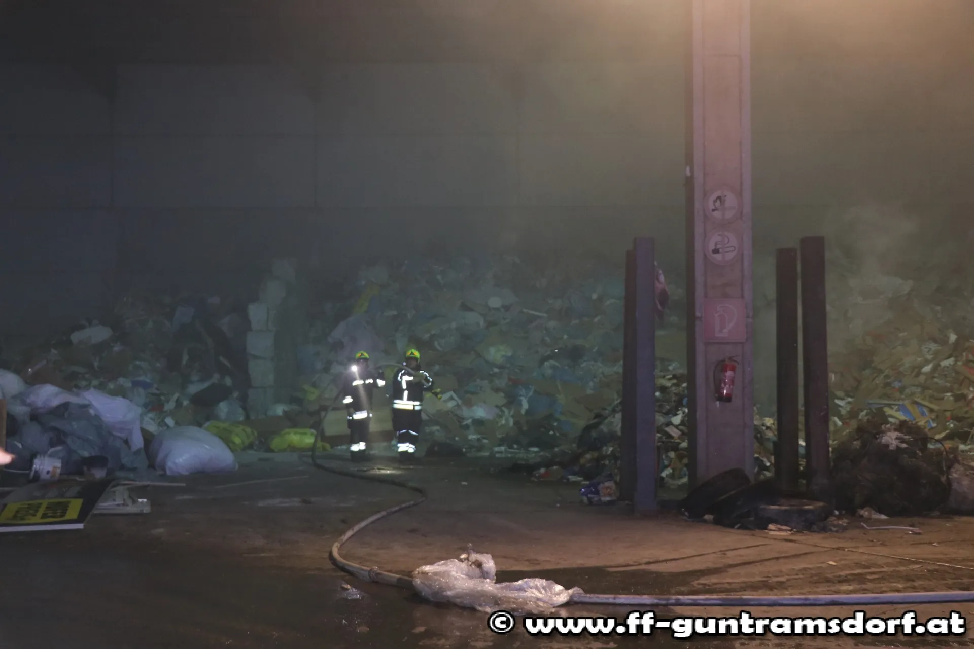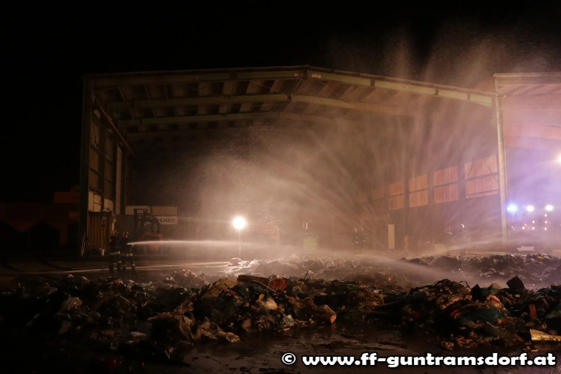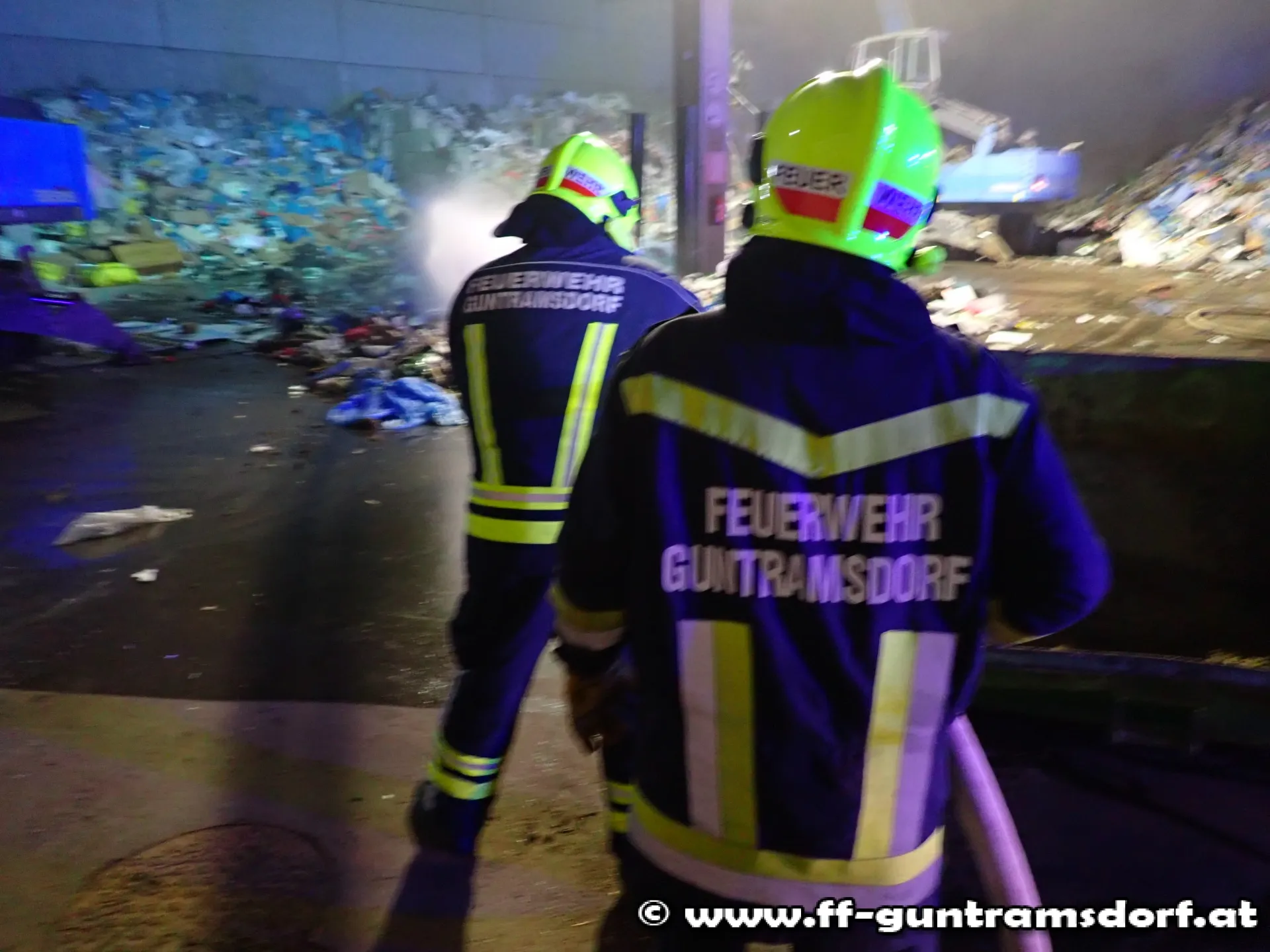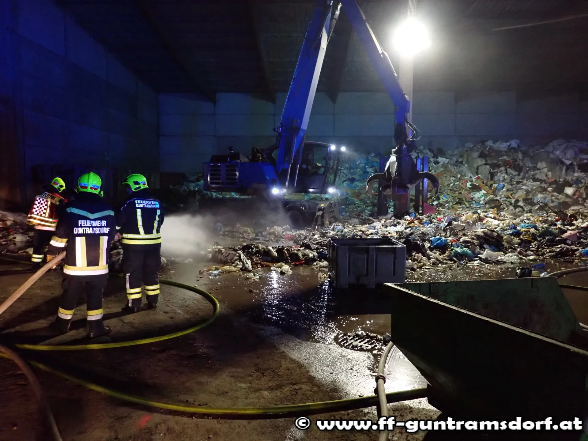 Kurz nach der Alarmierung stellten die ersteintreffenden Kräfte eine Rauchentwicklung in einer Lagerhalle, wo ca. 200 Tonnen Restmüll gelagert werden, fest. Unverzüglich fuhren die Tanklöschfahrzeuge in das Betriebsgelände ein und zwei Atemschutztrupps gingen zur Erkundung vor. Der Brandherd lag in ca. 3 Meter Tiefe begraben. Da die Trupps mit reiner Muskelkraft nicht zum Brandherd vordringen konnten, stellte die Firma mehrere Bagger zur Verfügung und trugen den brennenden Restmüll Stück für Stück ab. Dabei stellte sich heraus, dass der Brand doch schon weit fortgeschritten war, sodass umfangreiche Löschmaßnahmen erforderlich waren. Da kein rasches Ende in Sicht war, ließ der Einsatzleiter die Feuerwehr Gumpoldskirchen nachalarmieren. Mittels fünf C-Löschleitungen und einem Wasserwerfer wurden über 250.000 Liter Wasser aufgebracht um den Brand zu bekämpfen. Nach knapp vier Stunden konnten die ersten Kräfte die Einsatzstelle verlassen und der Großteil der Löschleitungen abgebaut werden.