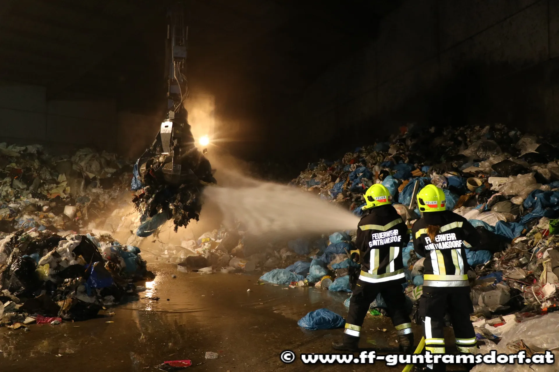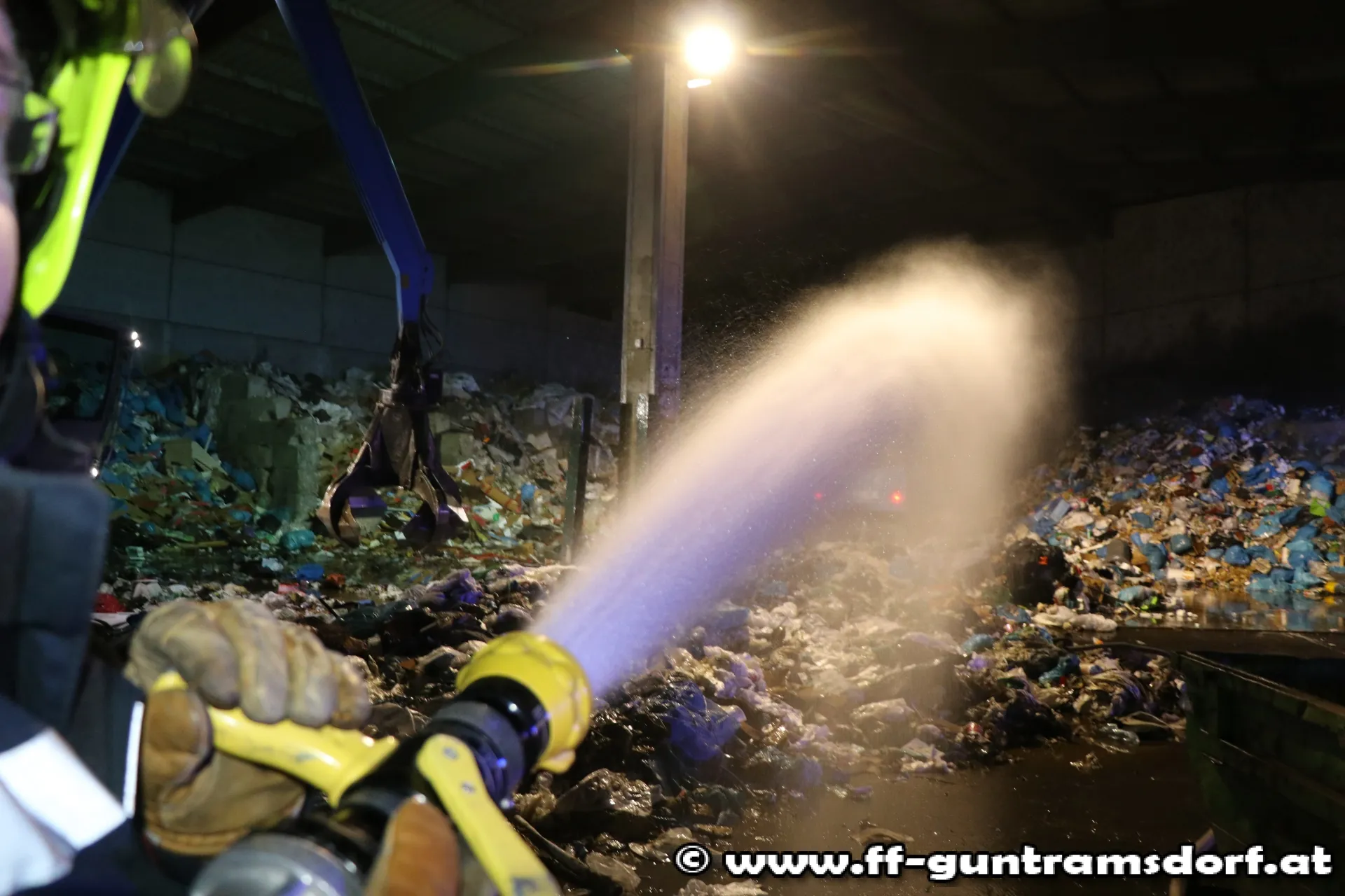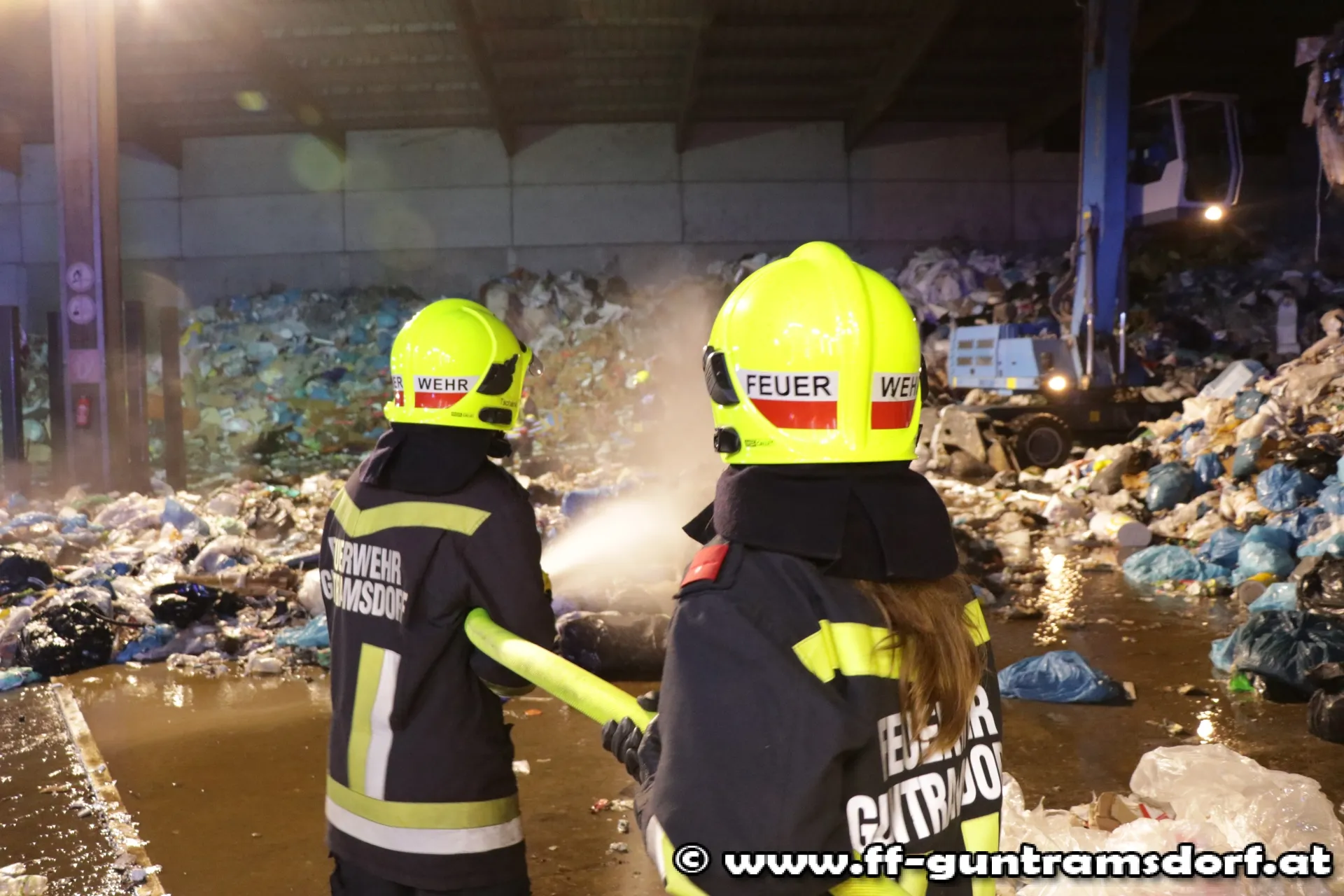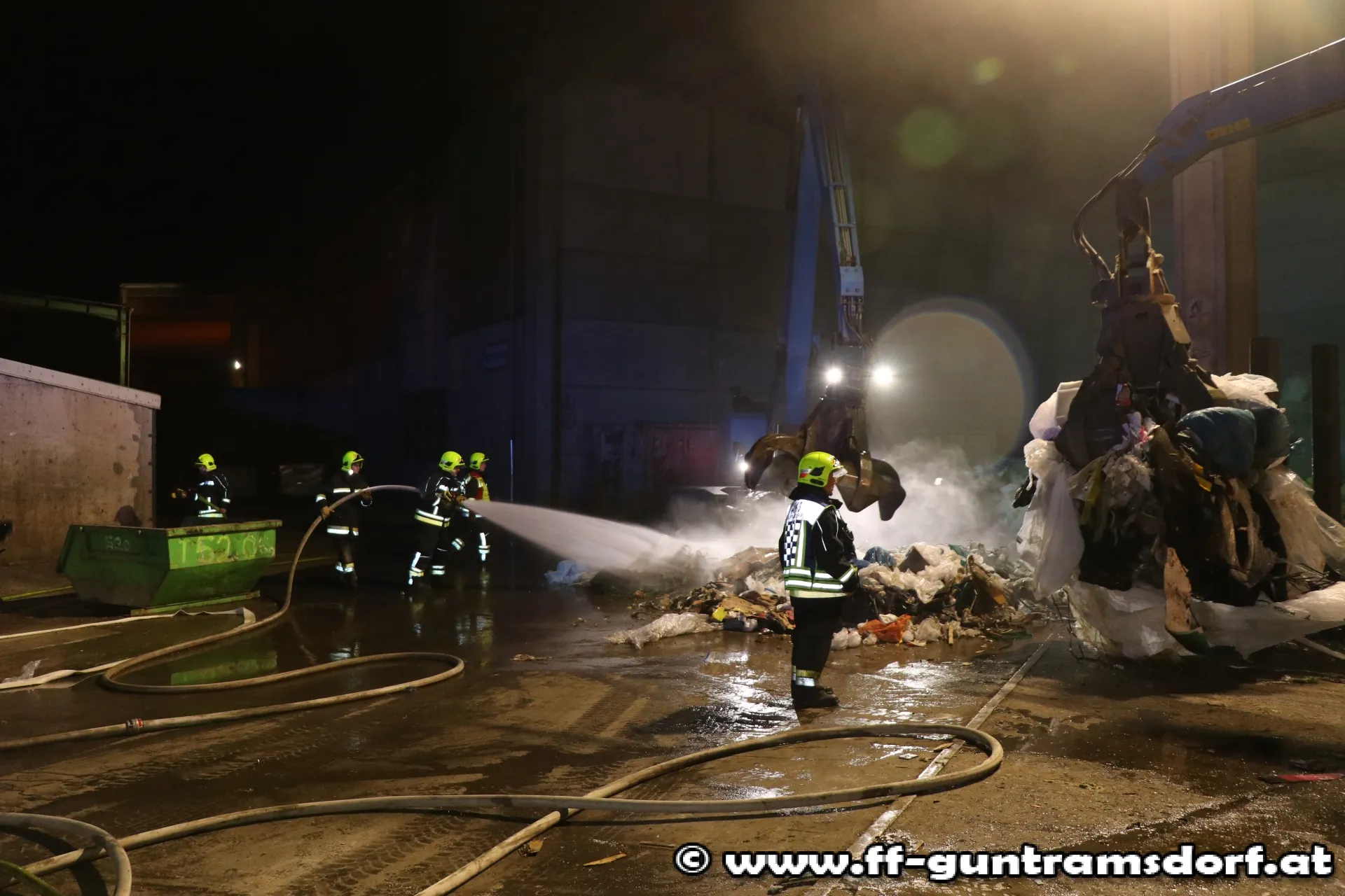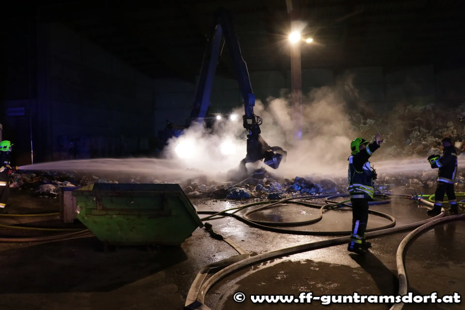 Kurz nach der Alarmierung stellten die ersteintreffenden Kräfte eine Rauchentwicklung in einer Lagerhalle, wo ca. 200 Tonnen Restmüll gelagert werden, fest. Unverzüglich fuhren die Tanklöschfahrzeuge in das Betriebsgelände ein und zwei Atemschutztrupps gingen zur Erkundung vor. Der Brandherd lag in ca. 3 Meter Tiefe begraben. Da die Trupps mit reiner Muskelkraft nicht zum Brandherd vordringen konnten, stellte die Firma mehrere Bagger zur Verfügung und trugen den brennenden Restmüll Stück für Stück ab. Dabei stellte sich heraus, dass der Brand doch schon weit fortgeschritten war, sodass umfangreiche Löschmaßnahmen erforderlich waren. Da kein rasches Ende in Sicht war, ließ der Einsatzleiter die Feuerwehr Gumpoldskirchen nachalarmieren. Mittels fünf C-Löschleitungen und einem Wasserwerfer wurden über 250.000 Liter Wasser aufgebracht um den Brand zu bekämpfen. Nach knapp vier Stunden konnten die ersten Kräfte die Einsatzstelle verlassen und der Großteil der Löschleitungen abgebaut werden.