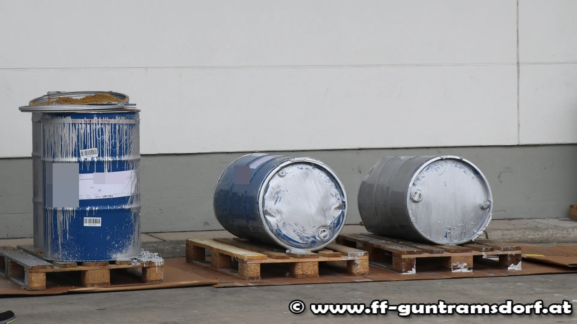 Durch die Druckentwicklung im Faß wurde der Deckel weggeschleudert. Infolgedessen fielen die benachbarten Fässer zu Boden. Da auf ausreichend Sicherheitsabstand geachtet wurde, kam kein Feuerwehrmitglied zu Schaden. Um ein weiteres Auslaufen des Inhaltes zu unterbinden, entschied man sich diese unter Atemschutz und Schutzanzügen (gegen die Verschmutzung) zu bergen.