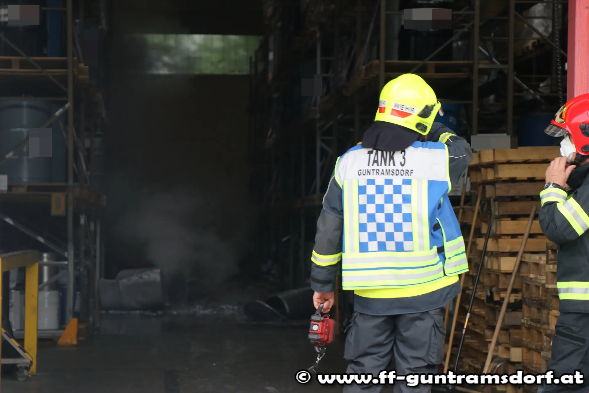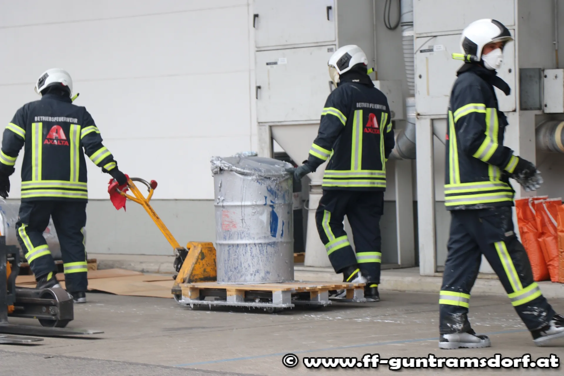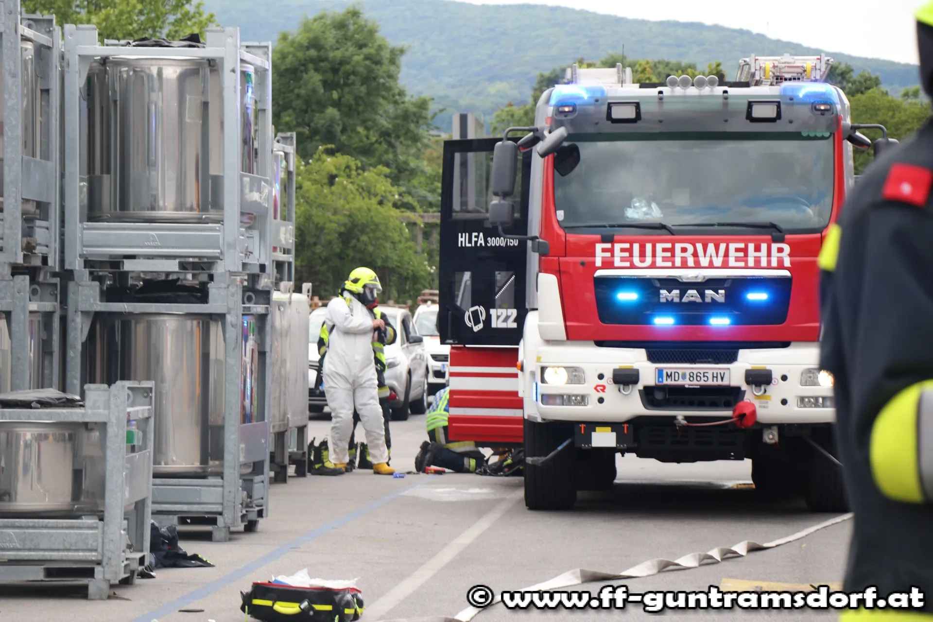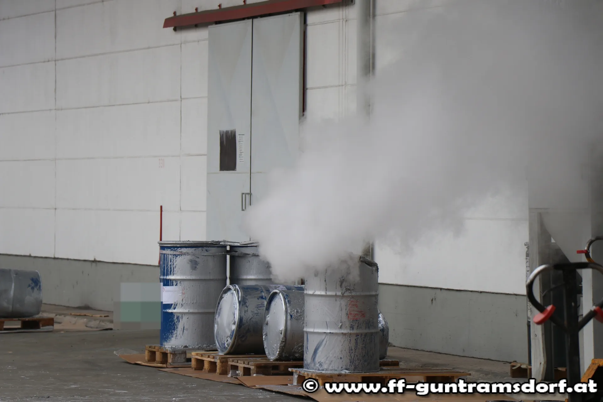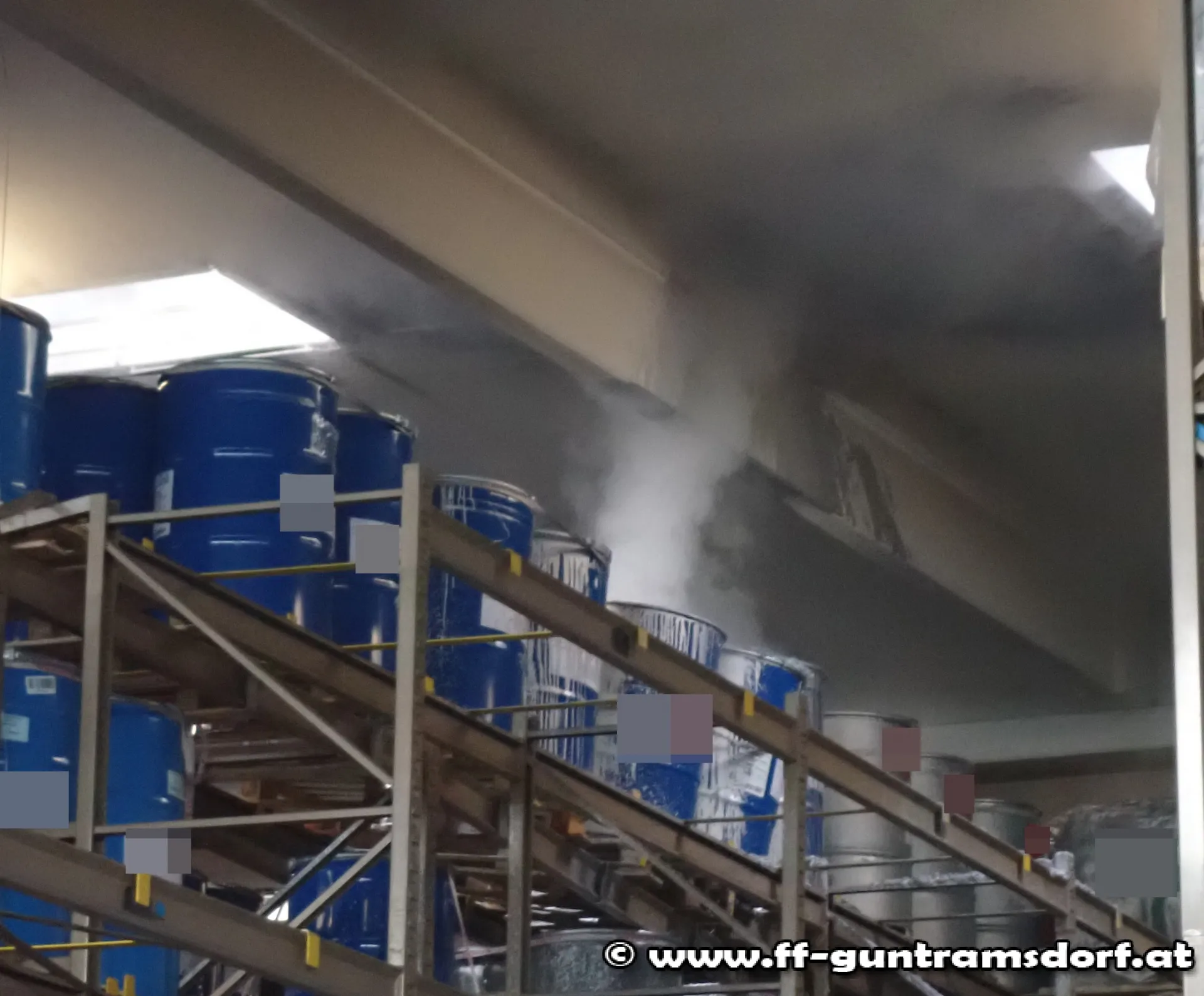 In einem im Hochregal gelagerten Fass kam es zu einer chemischen Reaktion, wodurch sich Wasserdampf entwickelte. Als Erstmaßnahmen wurde die Rauchwärmeabzugsanlage der Halle aktiviert und mehrere Belüfter in Stellung gebracht. Ebenfalls bauten die Kräfte der Feuerwehr Guntramsdorf einen Brandschutz auf. Der Atemschutztrupp kontrollierte laufend das Fass mittels Wärmebildkamera.