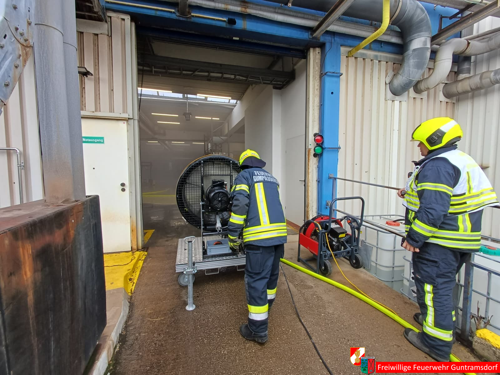 Glücklicherweise gab es keine Verletzten. Unverzüglich rüstete sich ein Atemschutztrupp aus. Parallel dazu erhöhte der Einsatzleiter die Alarmstufe und ließ die Feuerwehr Guntramsdorf mittels Sirene und Gesamtalarm sowie die Betriebsfeuerwehr Axalta und die Feuerwehr Gumpoldskirchen nachalarmieren.