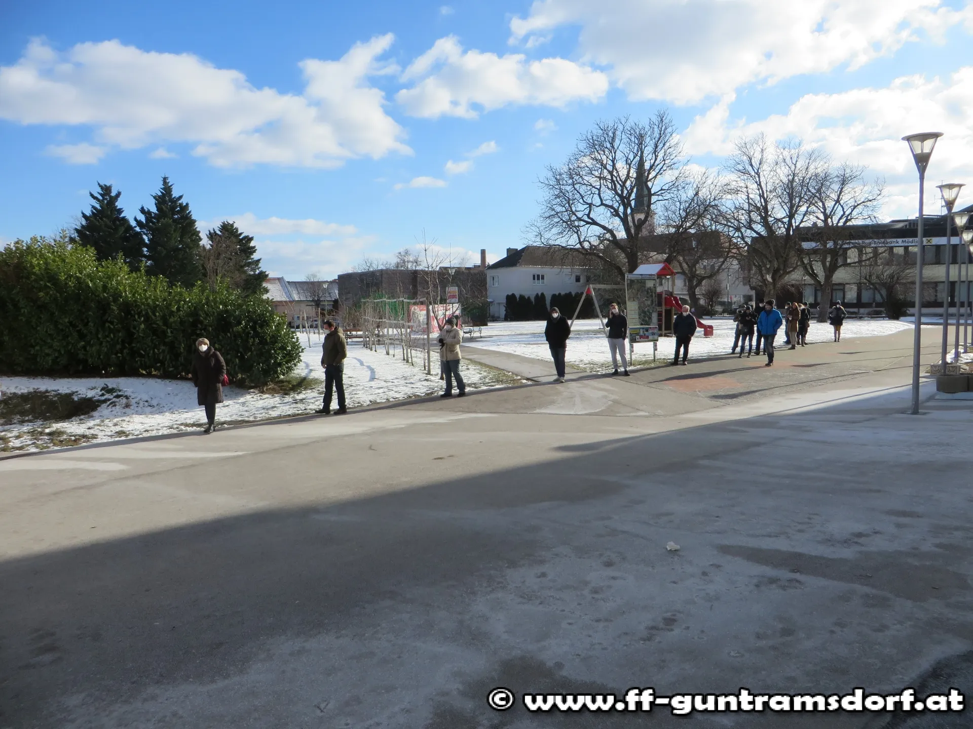 Und so fand am Freitag, dem 12.02.2021 der erste dieser von der FF Guntramsdorf betreuten Testtermine statt. Bereits vor Testbeginn um 13.00 bildete sich vor der Bibliothek im Regierungsviertel eine „lange Schlange“, wobei sich dies angesichts der (ordnungsgemäßen) großen Abstände zwischen den Testwilligen relativierte.