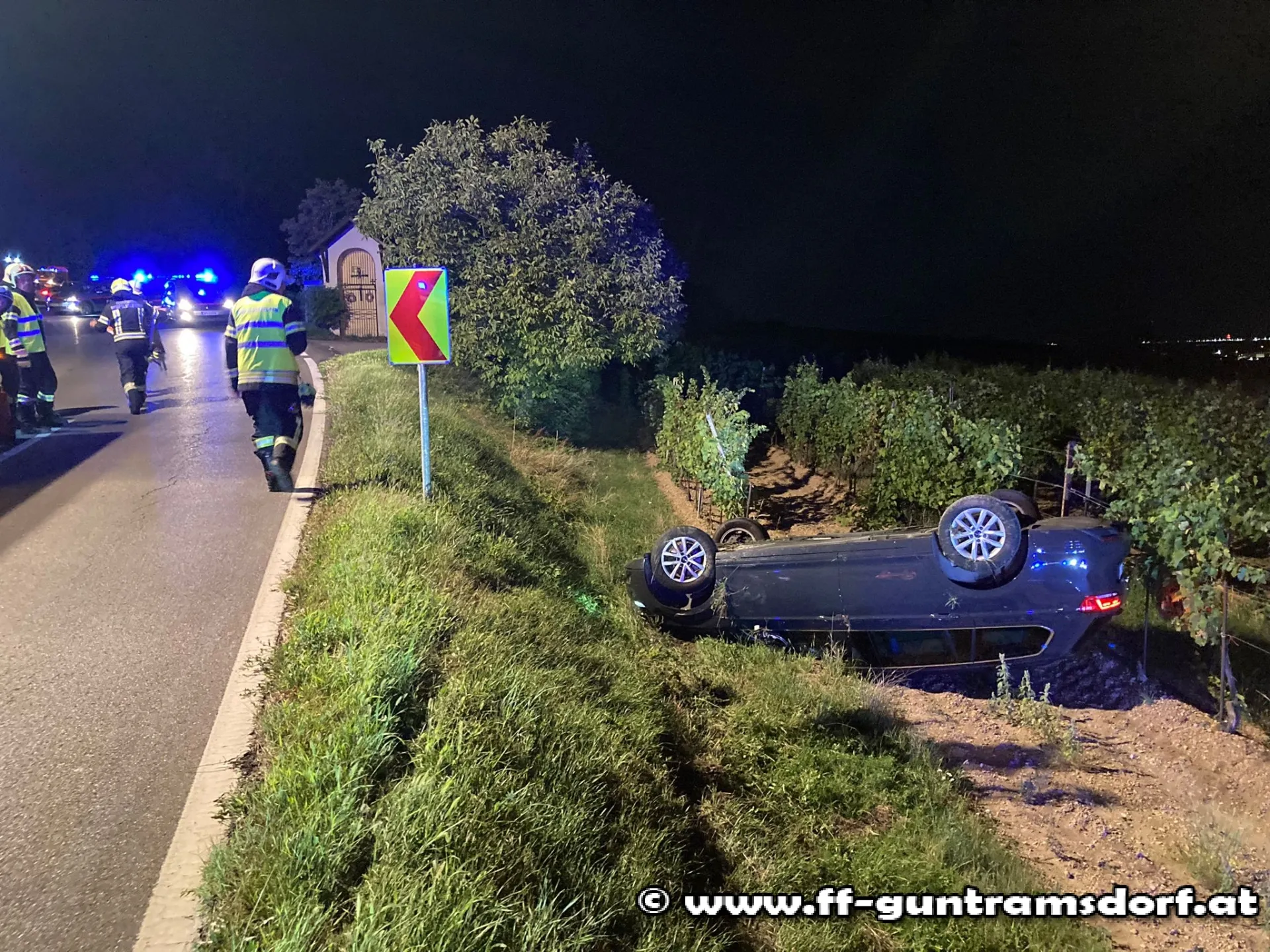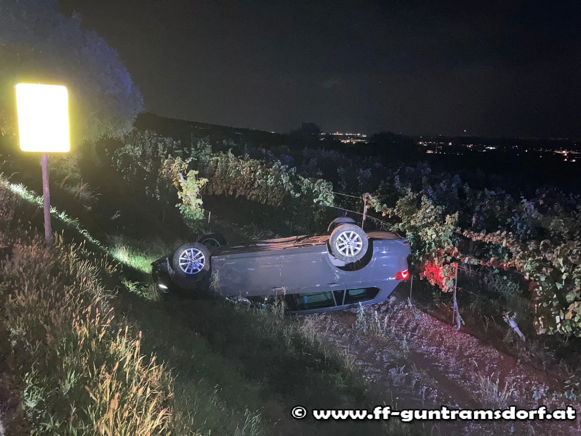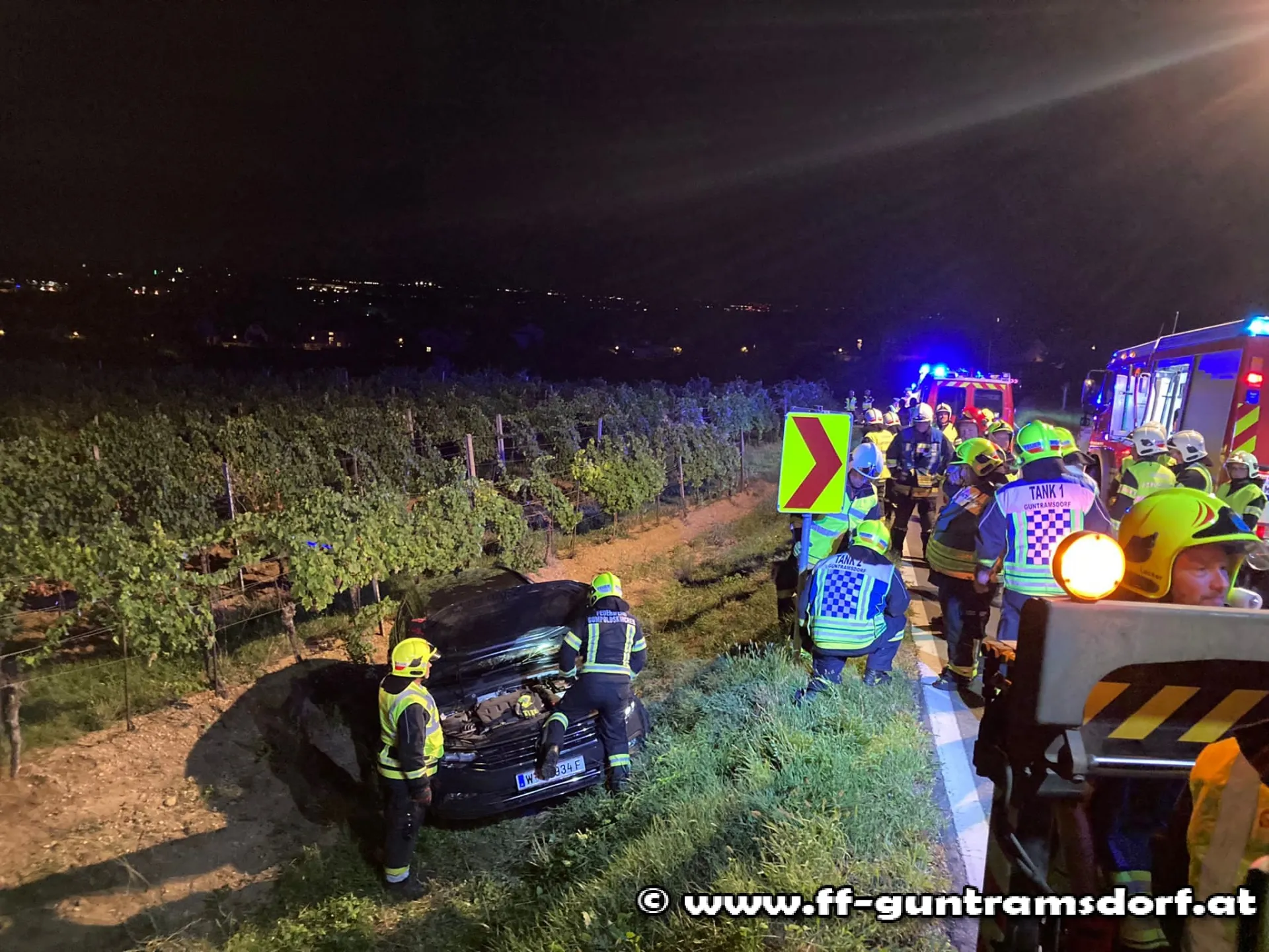 Kurz vor 22:30 Uhr wurde die Freiwillige Feuerwehr Gumpoldskirchen zu einem Verkehrsunfall mit einer eingeklemmten Person auf der Weinbergstraße, kurz nach der Ortsausfahrt Richtung Mödling, alarmiert. Da der Alarmplan der FF Gumpoldskirchen bei Einsätzen auf der Weinbergstraße ab Alarmstufe 2 auch die Alarmierung der FF Guntramsdorf vorsieht, wurde gleichzeitig auch die FF Guntramsdorf mitalarmiert, worauf 5 Fahrzeuge mit 23 Mitgliedern zur angegebenen Einsatzadresse ausrückten.