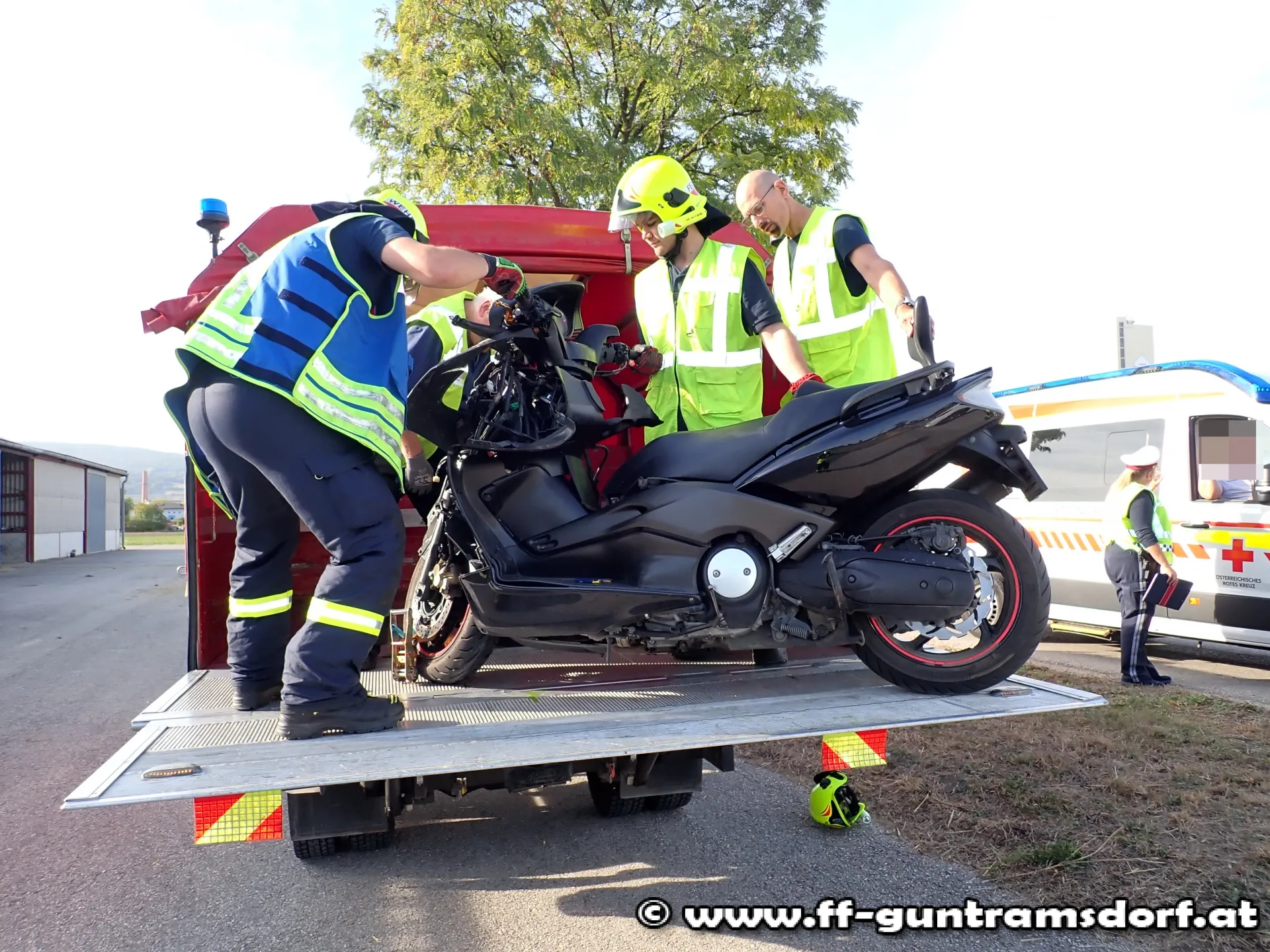 Ein Pkw und ein Motorrad waren zusammengestoßen. Beim Eintreffen der Feuerwehr wurde der Motorradlenker vom Rettungsdienst versorgt und zur weiteren Behandlung ins Krankenhaus verbracht. Nachdem die Polizei ihre Arbeiten abgeschlossen hatte, wurde das Motorrad händisch auf die Ladefläche vom Last verladen und anschließend die Fahrbahn gereinigt.