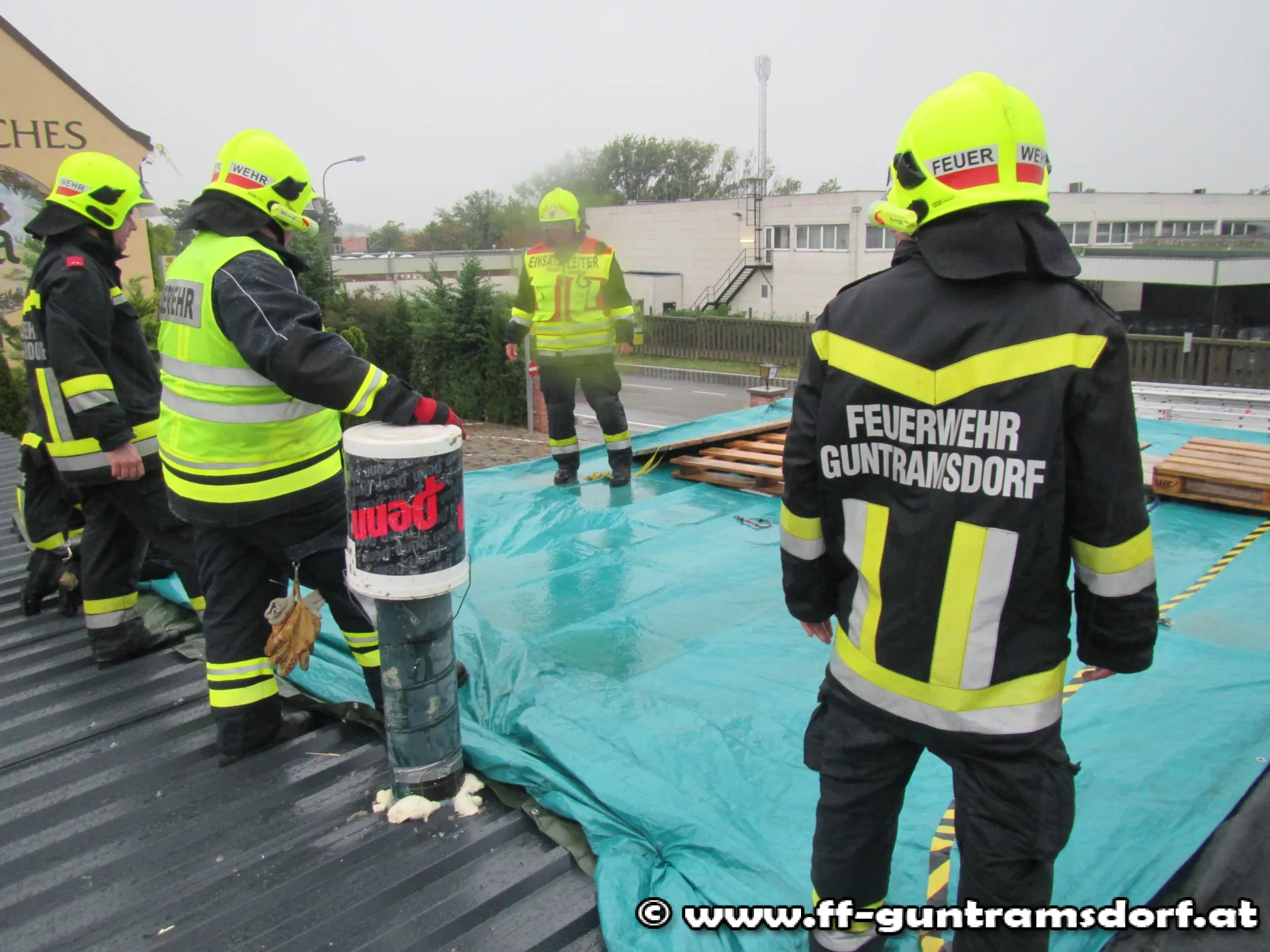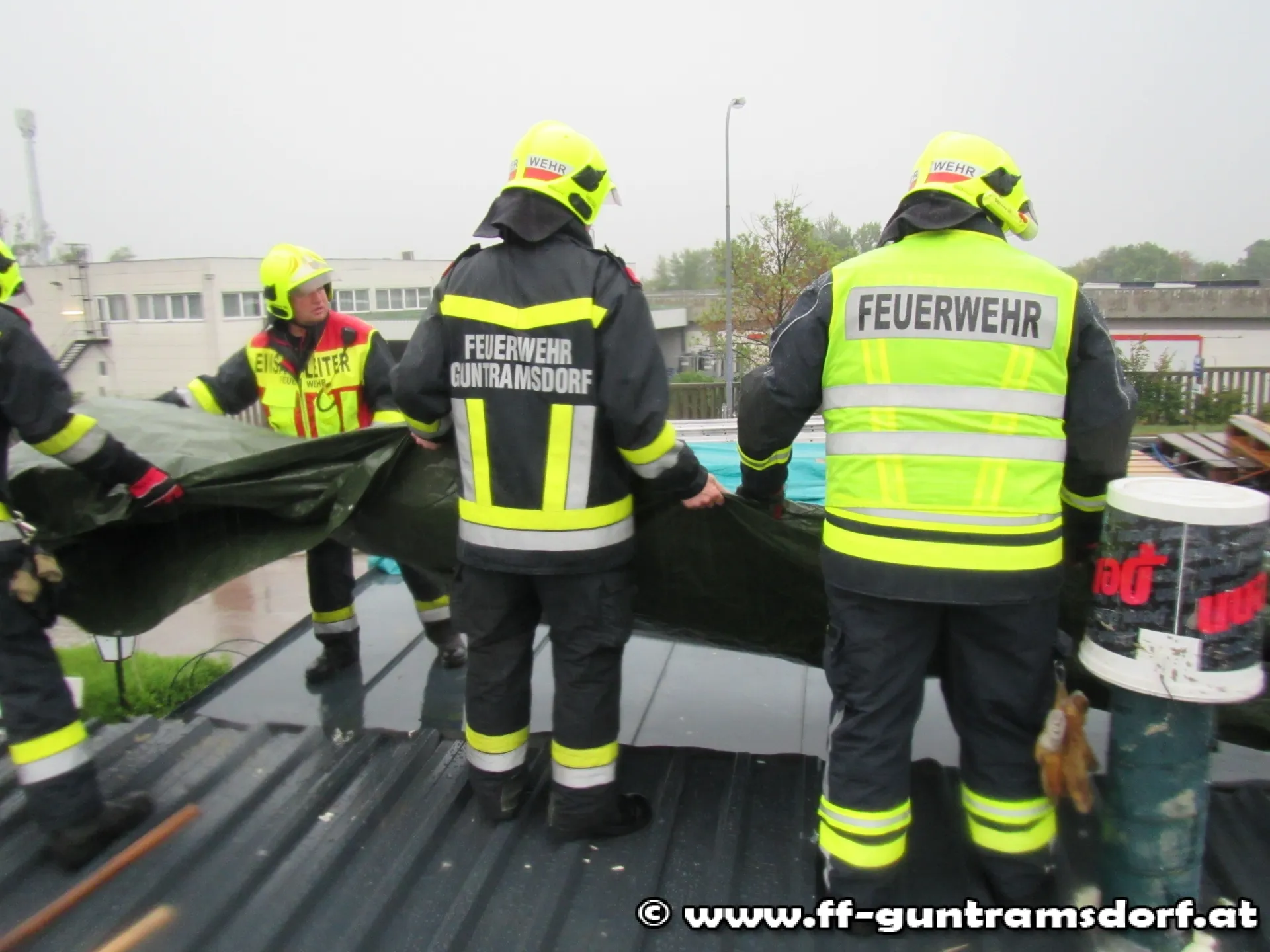 Um 7:57 Uhr wurde die Feuerwehr Guntramsdorf zu einer technischen Hilfeleistung auf die Triester Straße alarmiert. Bei einem im Umbau befindlichen Gaststüberl trat durch die starken Regenfälle Wasser über das Flachdach ein.