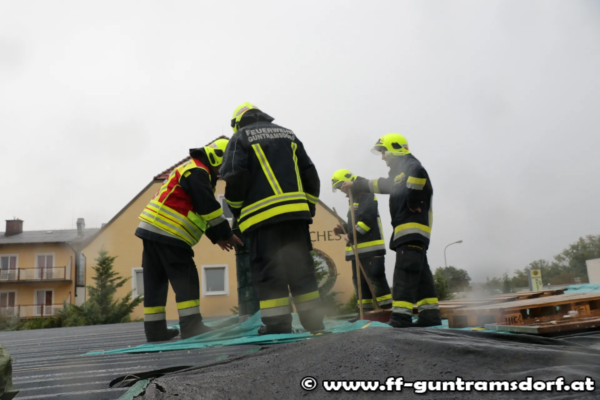 Die Feuerwehr Guntramsdorf rückte mit 3 Fahrzeugen zur Einsatzstelle aus und konnte mit Planen und Sandsäcken den Schaden am Dach provisorisch beheben.