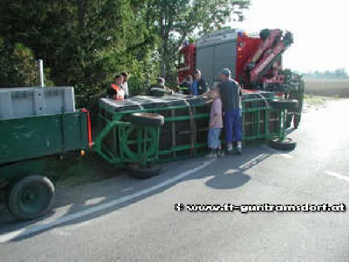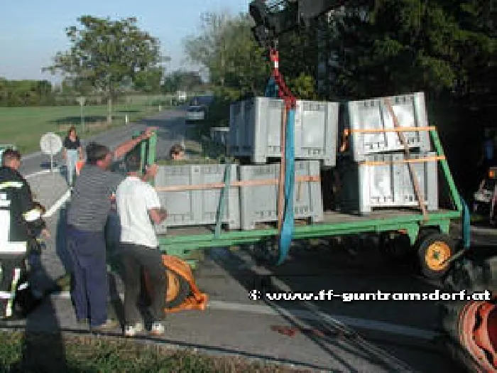 Ein Mödlinger Weinbauer war mit seinem Traktorzug – die beiden Anhänger waren voll beladen mit frisch gelesenen Weintrauben – Richtung Münchendorf unterwegs, als aus ungeklärter Ursache iin einem Kreisverkehr der hintere der beiden Anhänger plötzlich umkippte. Dabei blieben die fest verzurrten Kunststoffcontainer zwar auf der Ladefläche, die Weintrauben landeten aber fast zur Gänze auf der Fahrbahn.
