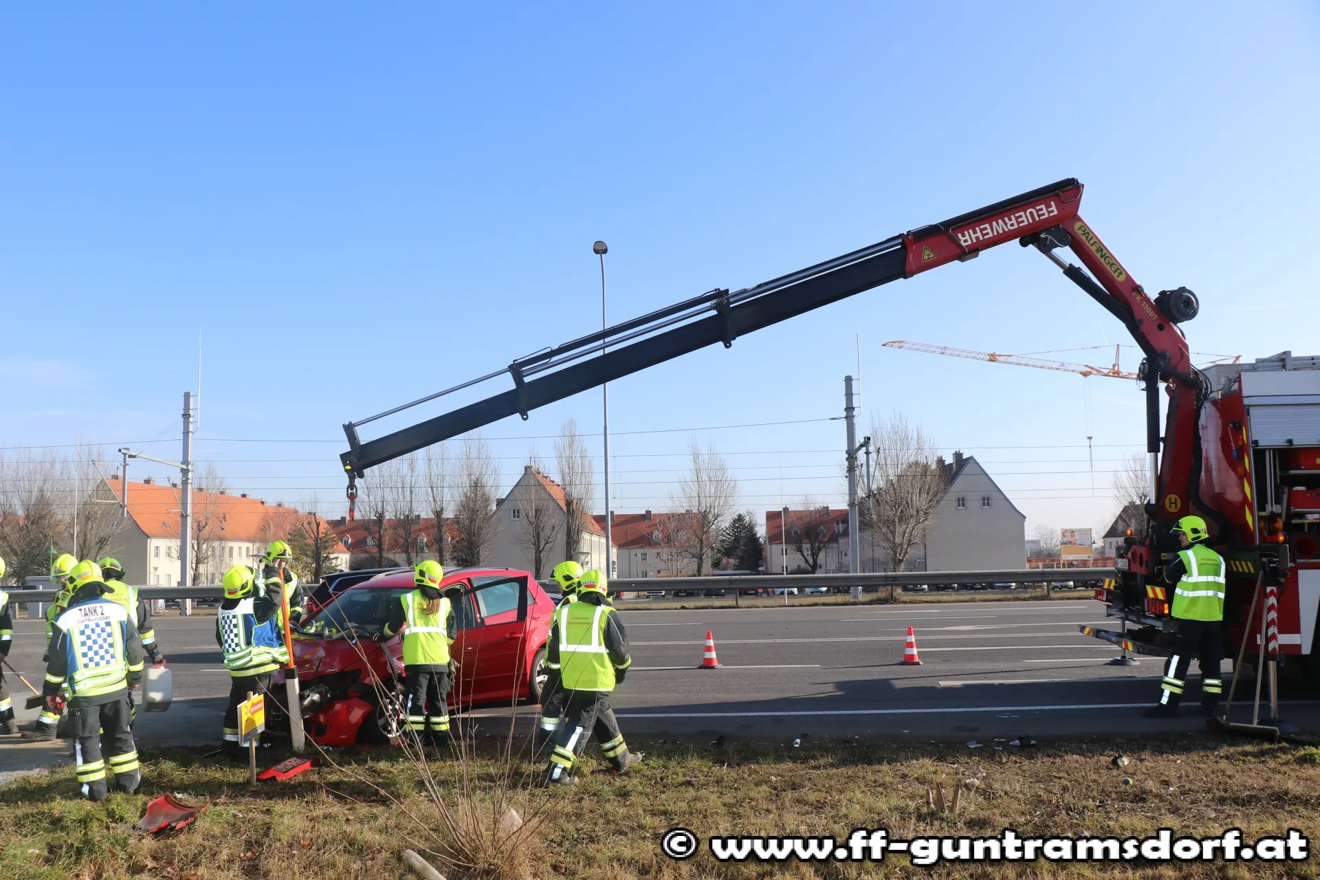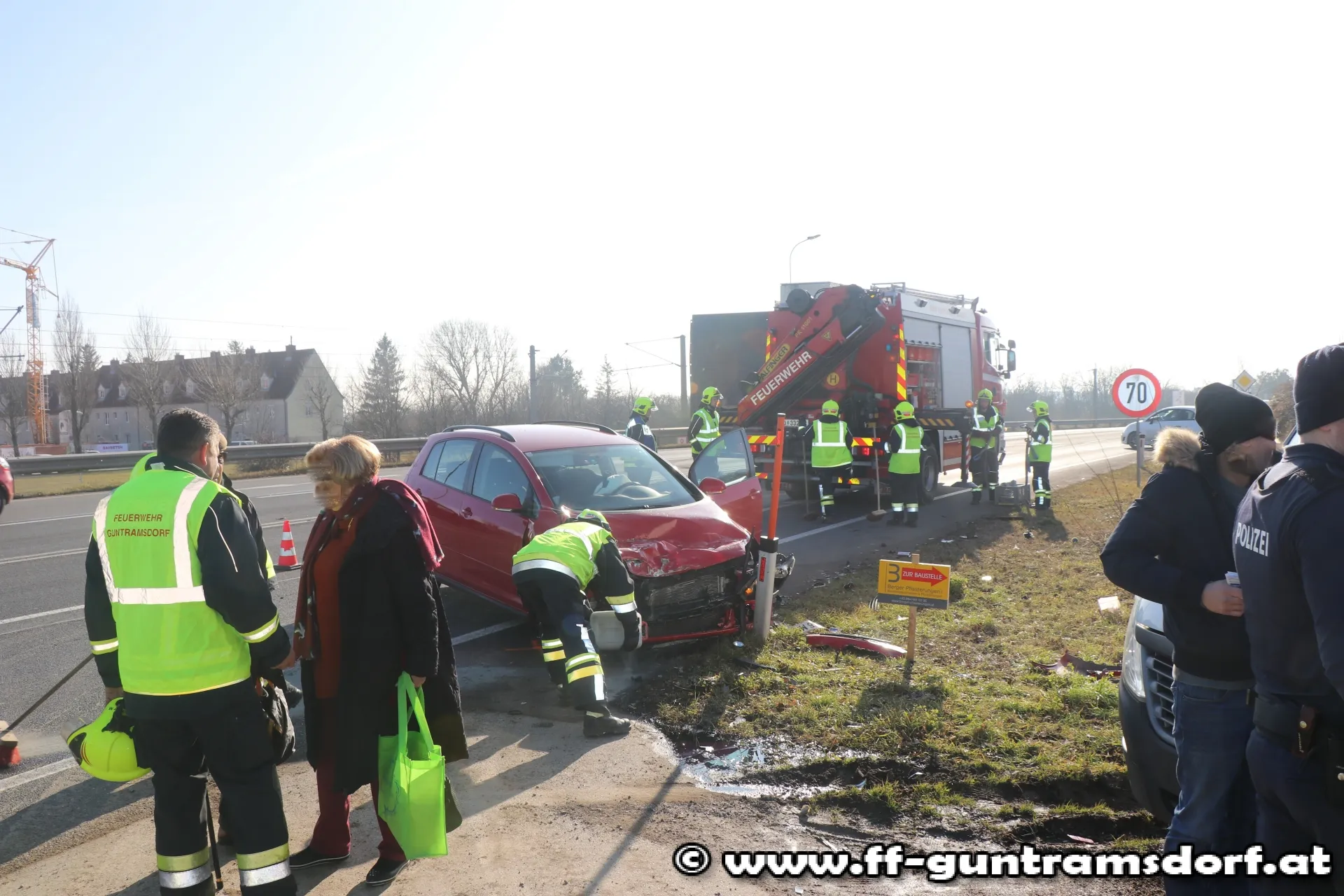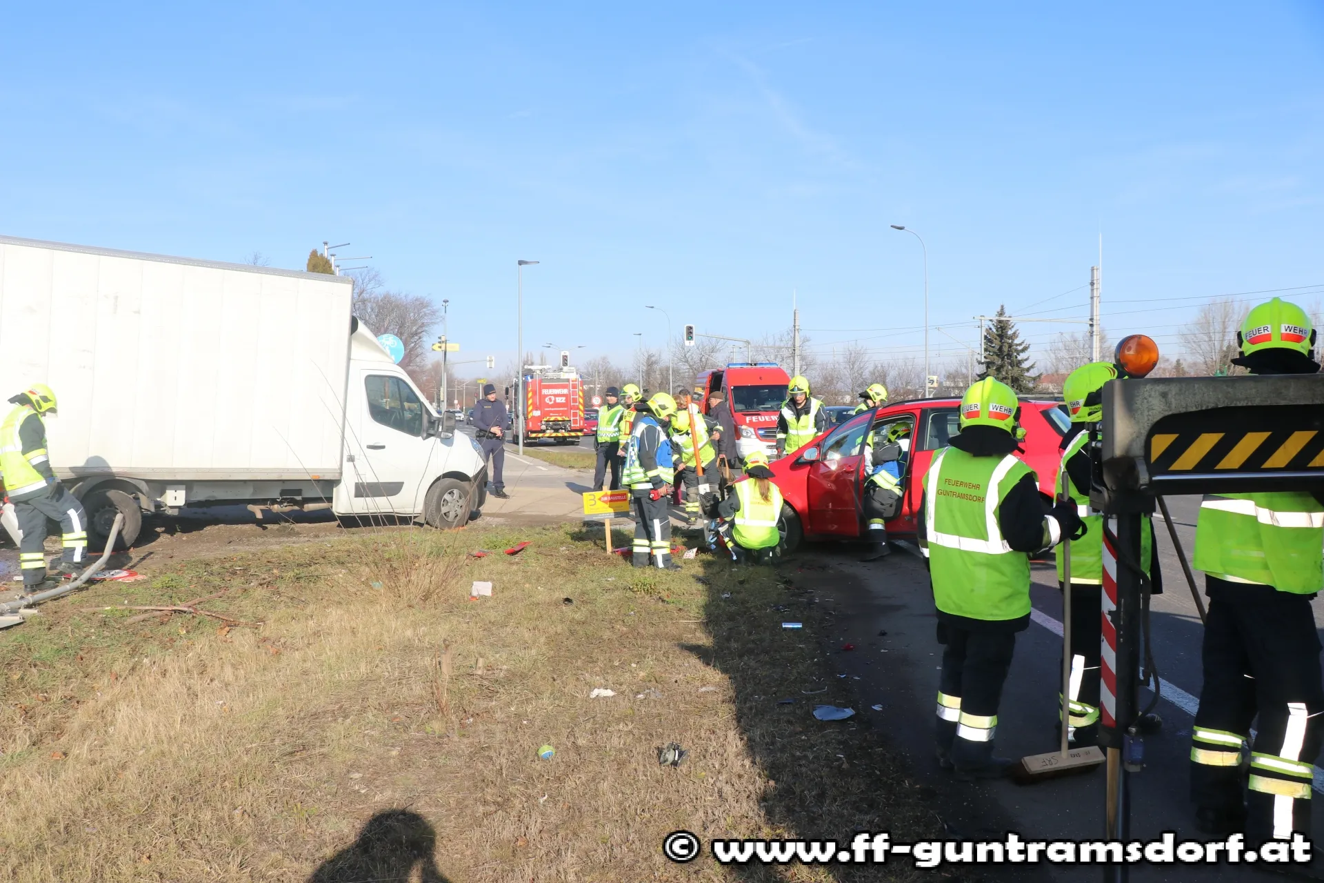 Ein aus Richtung Wien kommender PKW war mit einem aus Richtung Guntramsdorf kommenden Klein-LKW, der in den sog. „Kaiserweg“ (Güterweg Richtung Eichkogel, nahe der Kreuzung Viaduktstrasse /B 17) abbiegen wollte, zusammengestoßen. Die FF Guntramsdorf verbrachte den schwer beschädigten PKW auf einen Parkplatz. Der Klein-LKW konnte aus eigener Kraft die Fahrt fortsetzen. Die ausgelaufenen Betriebsmittel wurden mit Bindemittel unschädlich gemacht und die Einsatzstelle anschließend der Straßenmeisterei übergeben. Während der Bergungsarbeiten musste eine Fahrspur der B 17 gesperrt werden.