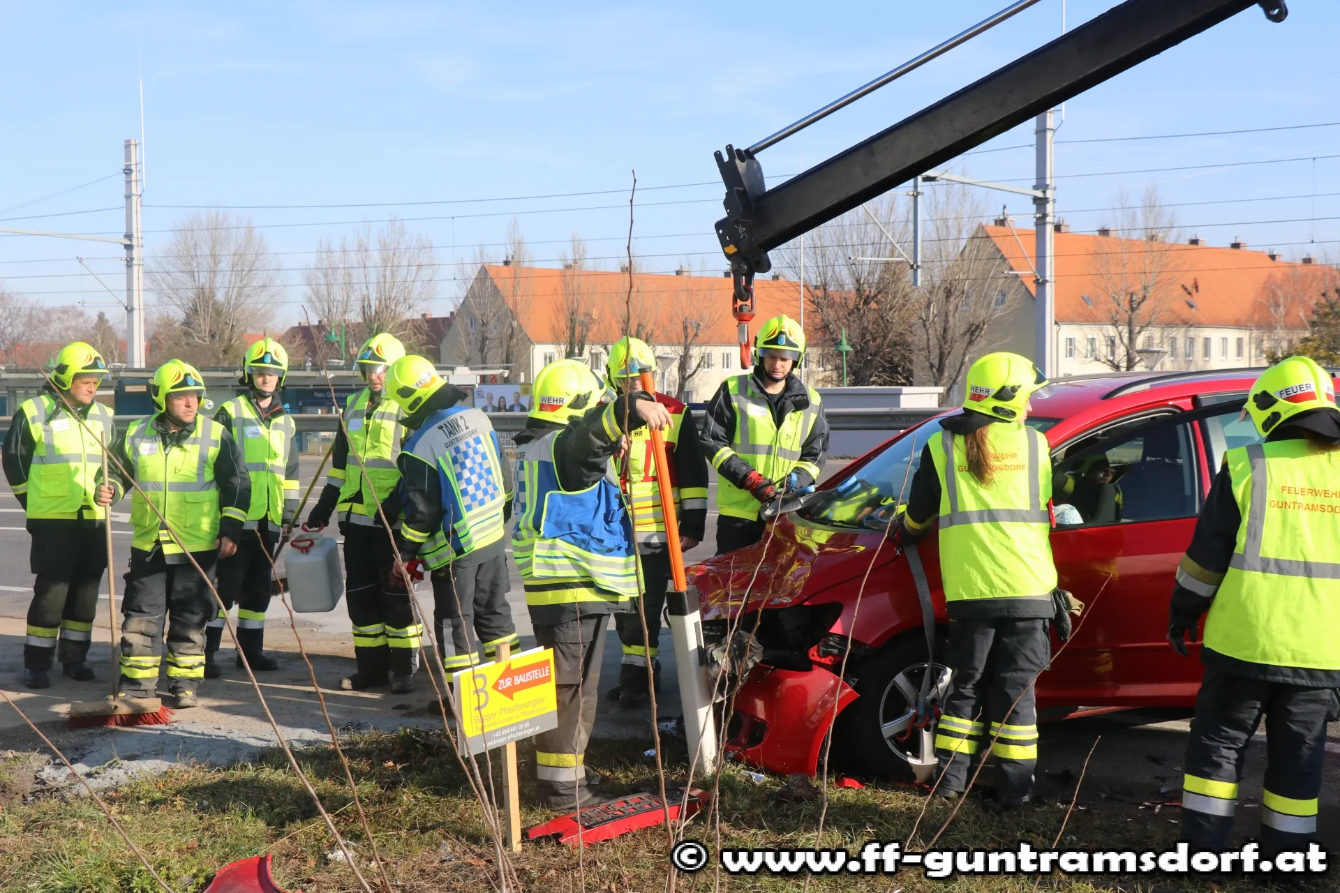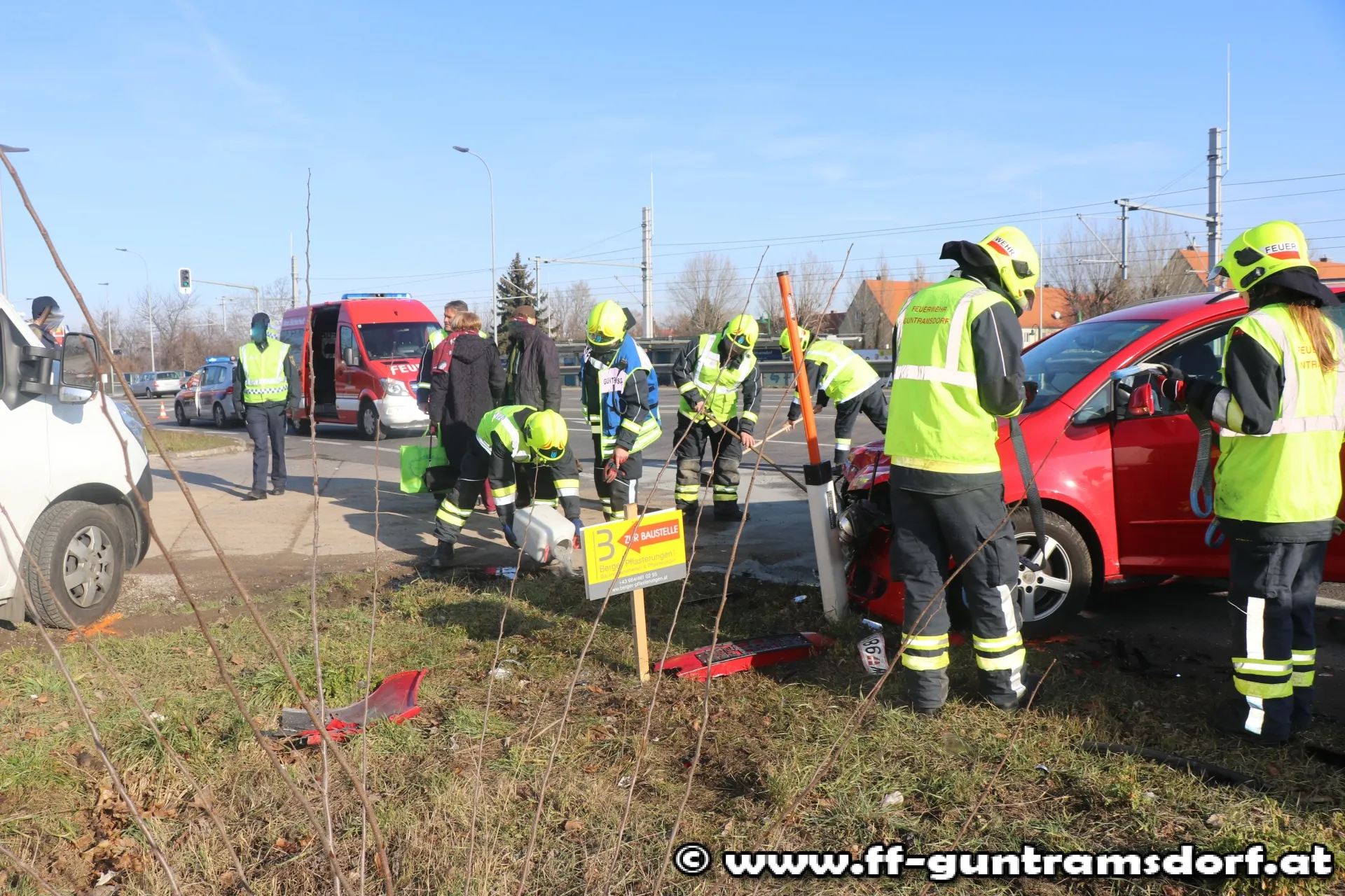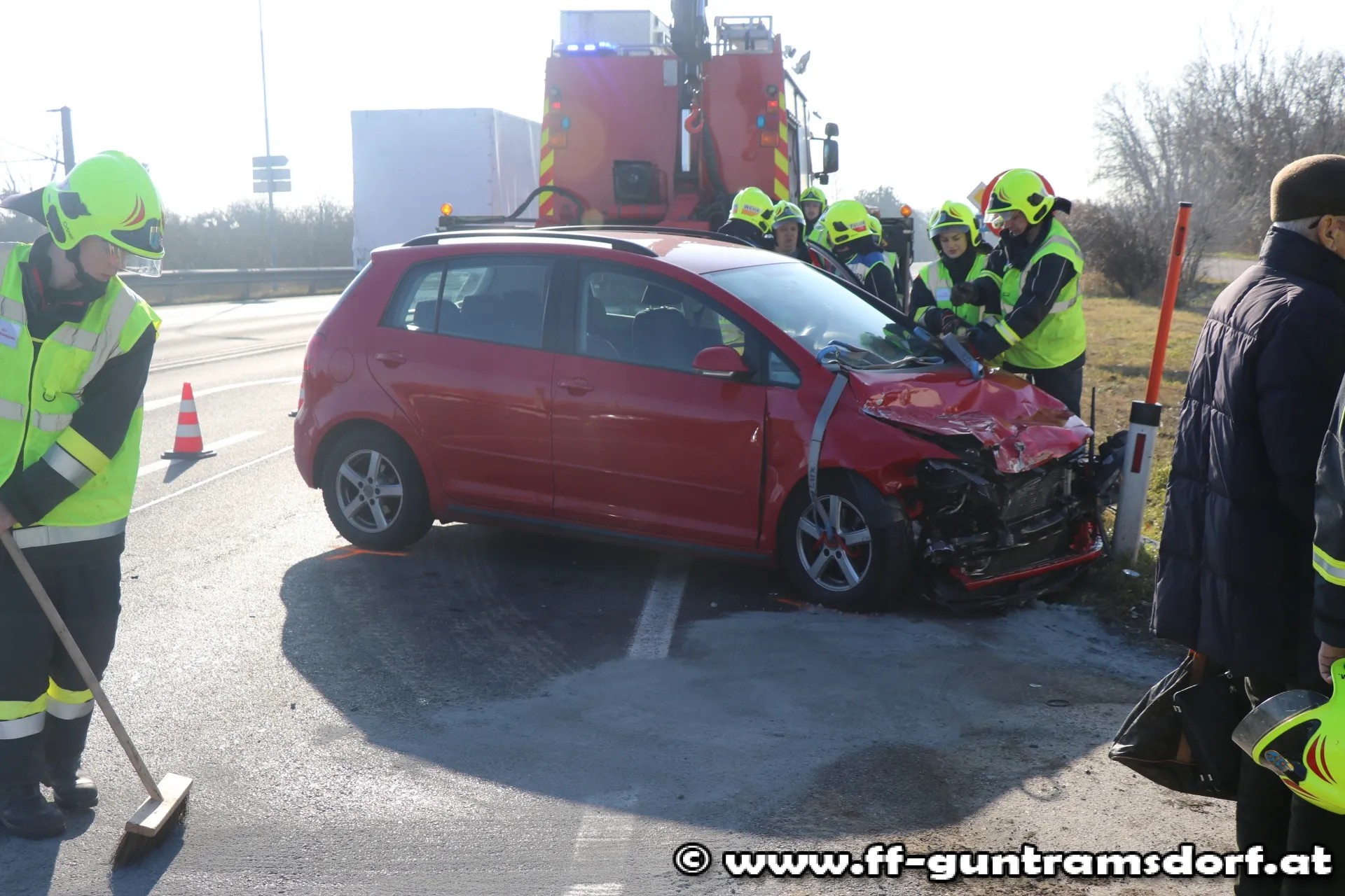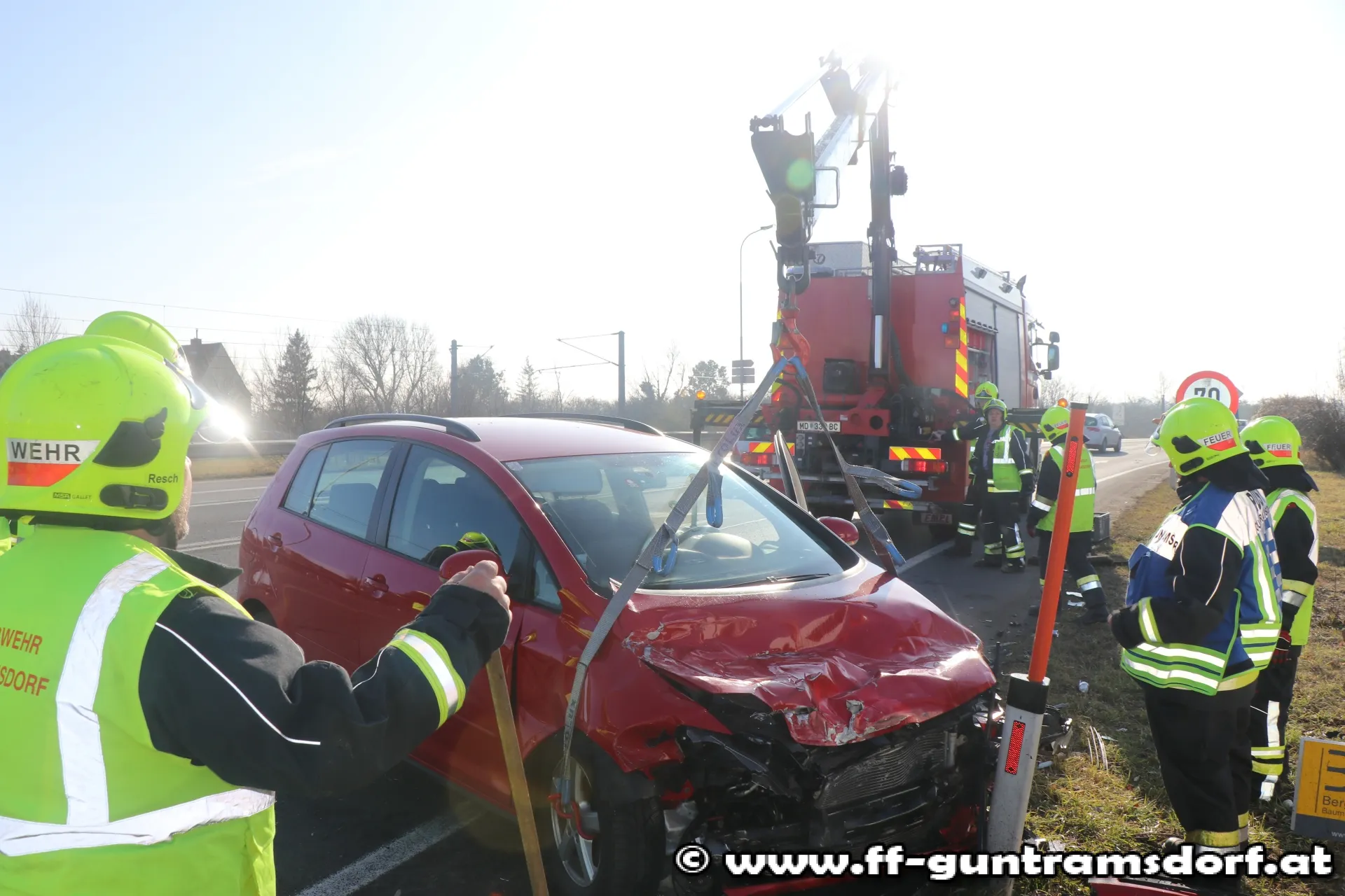Ein aus Richtung Wien kommender PKW war mit einem aus Richtung Guntramsdorf kommenden Klein-LKW, der in den sog. „Kaiserweg“ (Güterweg Richtung Eichkogel, nahe der Kreuzung Viaduktstrasse /B 17) abbiegen wollte, zusammengestoßen. Die FF Guntramsdorf verbrachte den schwer beschädigten PKW auf einen Parkplatz. Der Klein-LKW konnte aus eigener Kraft die Fahrt fortsetzen. Die ausgelaufenen Betriebsmittel wurden mit Bindemittel unschädlich gemacht und die Einsatzstelle anschließend der Straßenmeisterei übergeben. Während der Bergungsarbeiten musste eine Fahrspur der B 17 gesperrt werden.