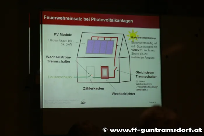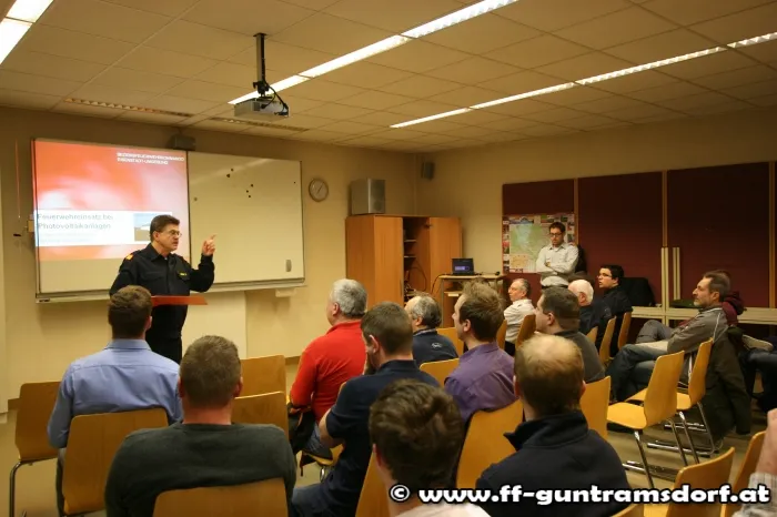 Vor insgesamt mehr als 50 Schulungsteilnehmern referierte der Gastvortragende Abschnittsbrandinspektor DI Peter Berghofer (FF Müllendorf, Bgld.) über die Technik und die Gefahren von Photovoltaikanlagen. Nach dem Theorievortrag im Lehrsaal wurde eine örtliche Photovoltaikanlage besichtigt. An Hand dieses Praxisbeispiels wurden hier nochmals die Abschaltmöglichkeiten und Gefahren diskutiert und erklärt.