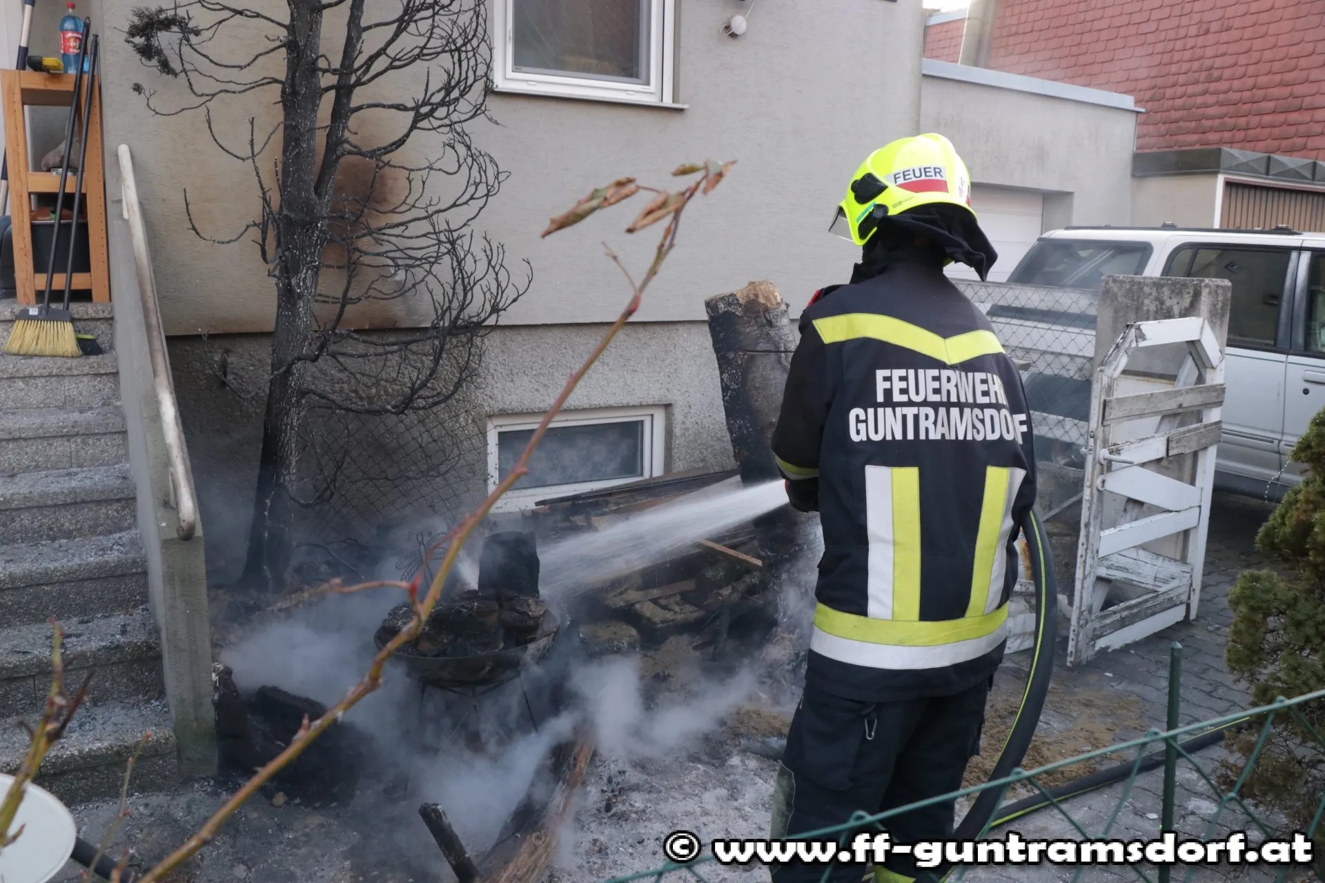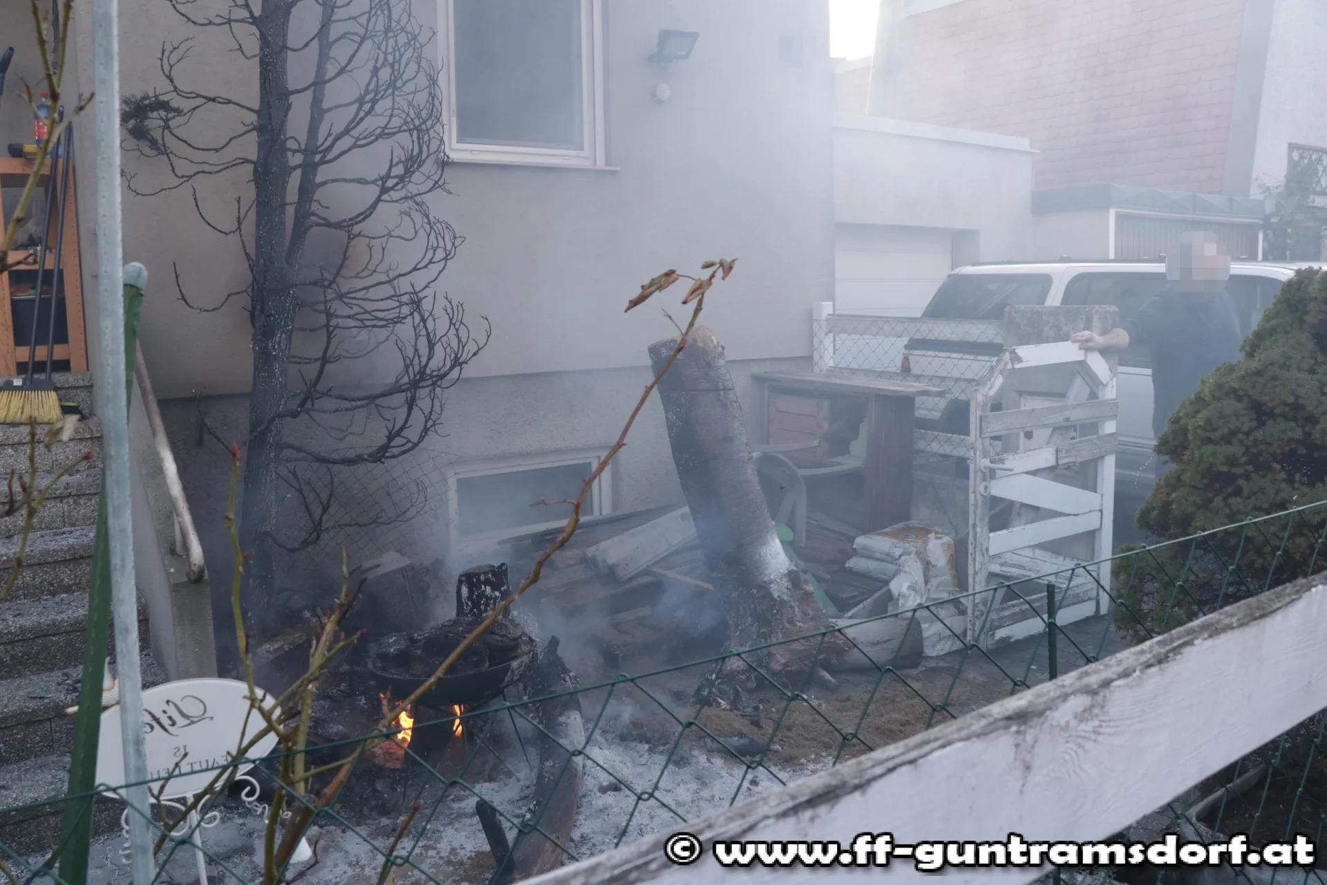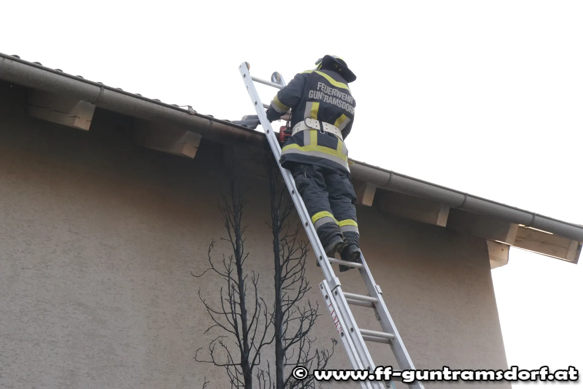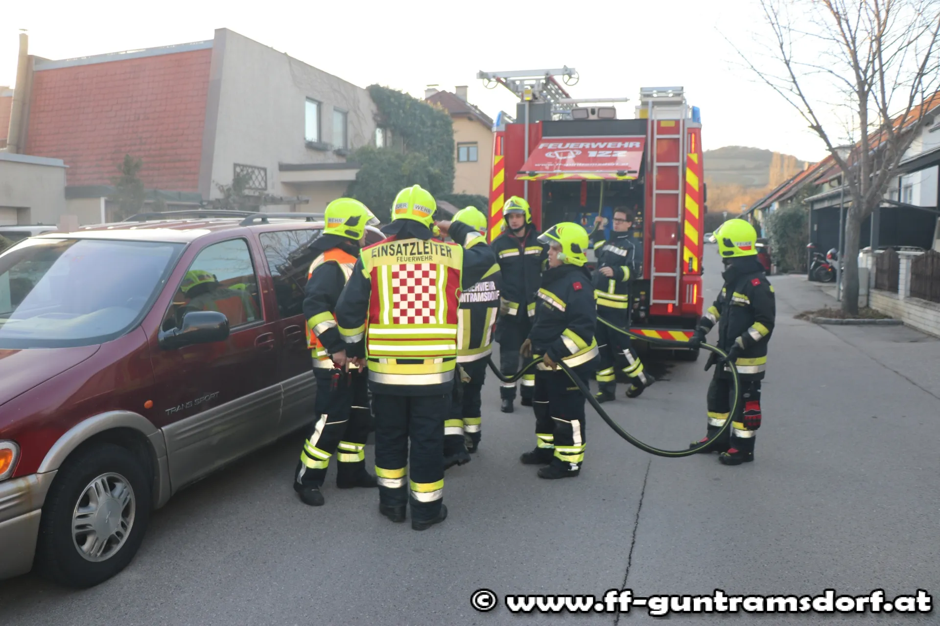 Beim Eintreffen der Kräfte führte der Wohnhausbesitzer mit einem Gartenschlauch bereits die erste Löschhilfe durch und verhinderte somit einen Wohnhausbrand. Im Vorgarten des Hauses war eine Mülltonne in Brand geraten und setzte das umliegende Gebüsch sowie eine unmittelbar in der Nähe gelagertes Holz in Brand. Mittels C-Schnellangriff von TANK 2 Guntramsdorf konnte der Brand rasch abgelöscht werden. Bei der Kontrolle mittels Wärmebildkamera wurde eine Wärmequelle im Dachbereich festgestellt. Unverzüglich wurde von der Mannschaft von TANK 1 Guntramsdorf die 2-teilige Schiebeleiter in Stellung gebracht. Ein in der Dachrinne befindliches leeres Vogelnest hatte Feuer gefangen und Teile des Daches in Brand gesetzt. Mittels Wärmebildkamera konnten alle betroffenen Stellen rasch gefunden und mit einem C-Strahlrohr gelöscht werden.