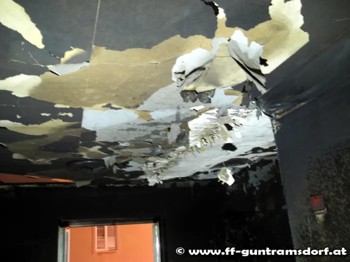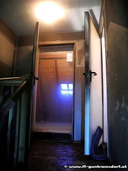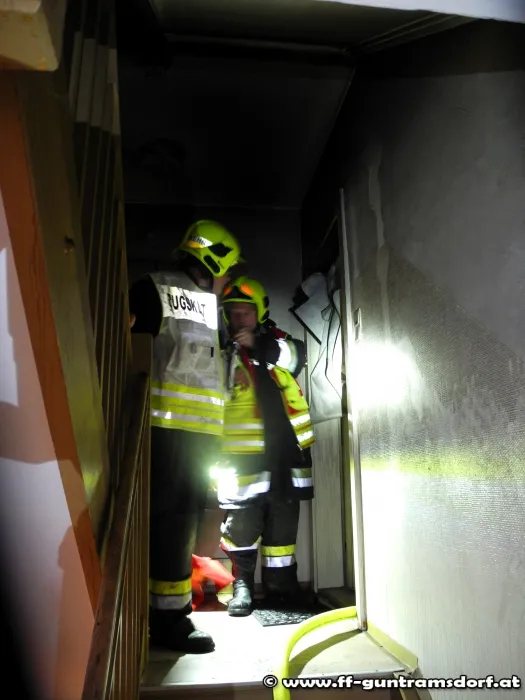 Da die Wohnungseingangstüre zur Brandwohnung offen stand war der gesamte Dachbodenbereich und das Stiegenhaus bis zum Zwischengeschoss bereits stark verraucht.