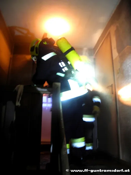 Der erste Atemschutztrupp begab sich, nach zusätzlicher Installation eines Rauchvorhanges, mit einem C Rohr zur Brandbekämpfung in die betroffene Wohnung im ersten Stock.