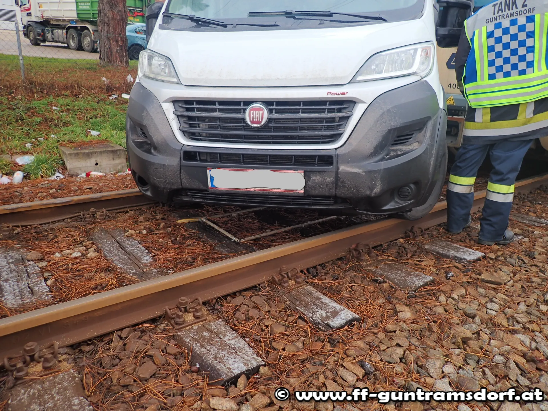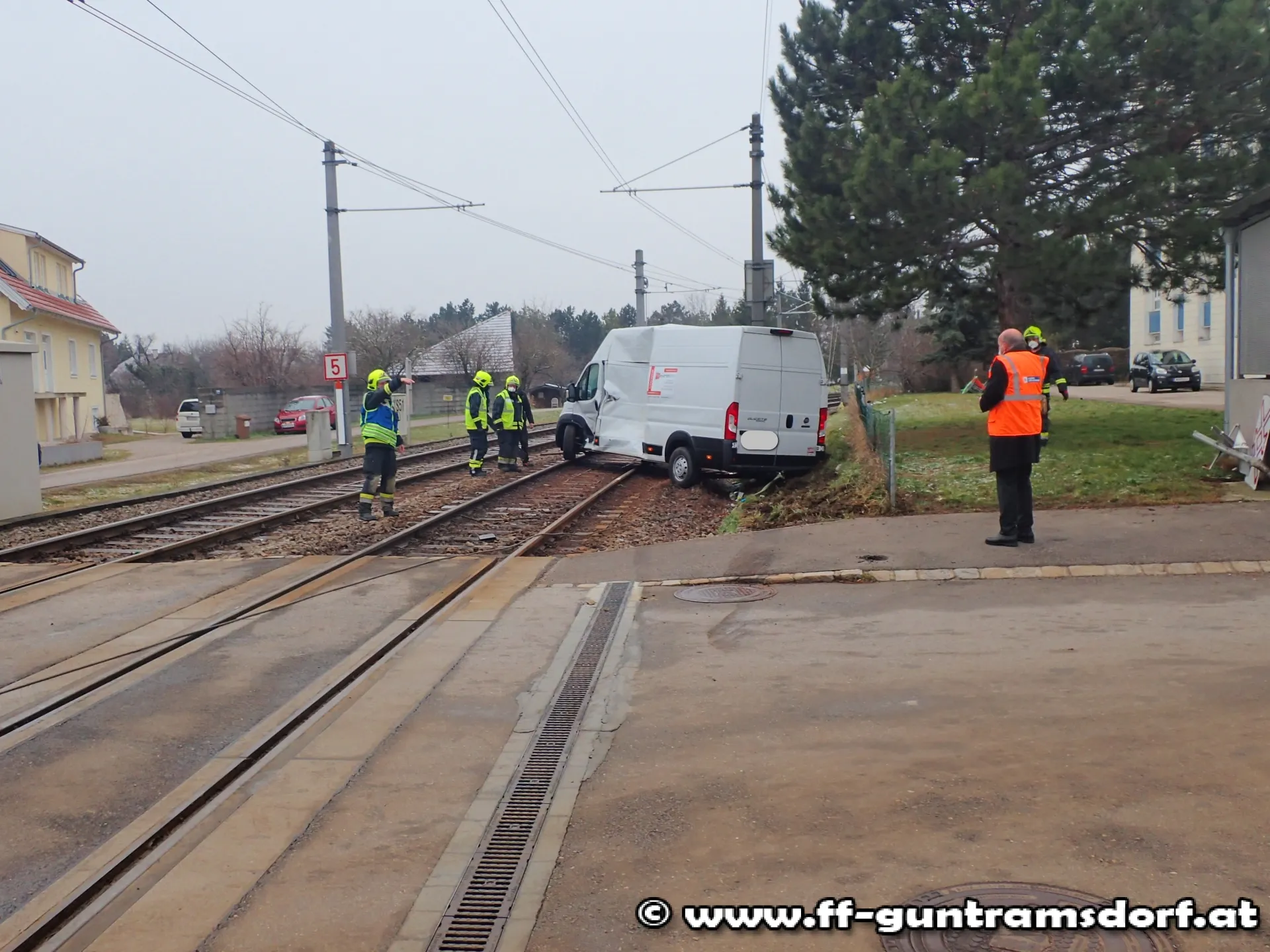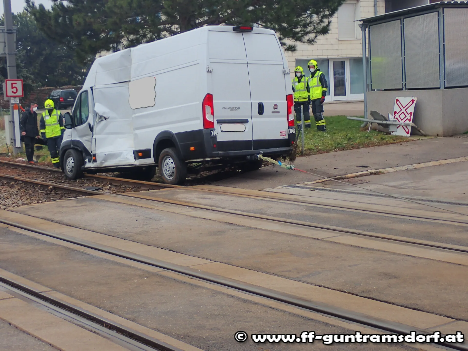 Nachdem die Unfallaufnahme abgeschlossen und der Zug aus dem Kreuzungsbereich gefahren waren, wurde der Transporter mit der Seilwinde des SRF zurück auf die Fahrbahn gezogen und händisch gesichert abgestellt.